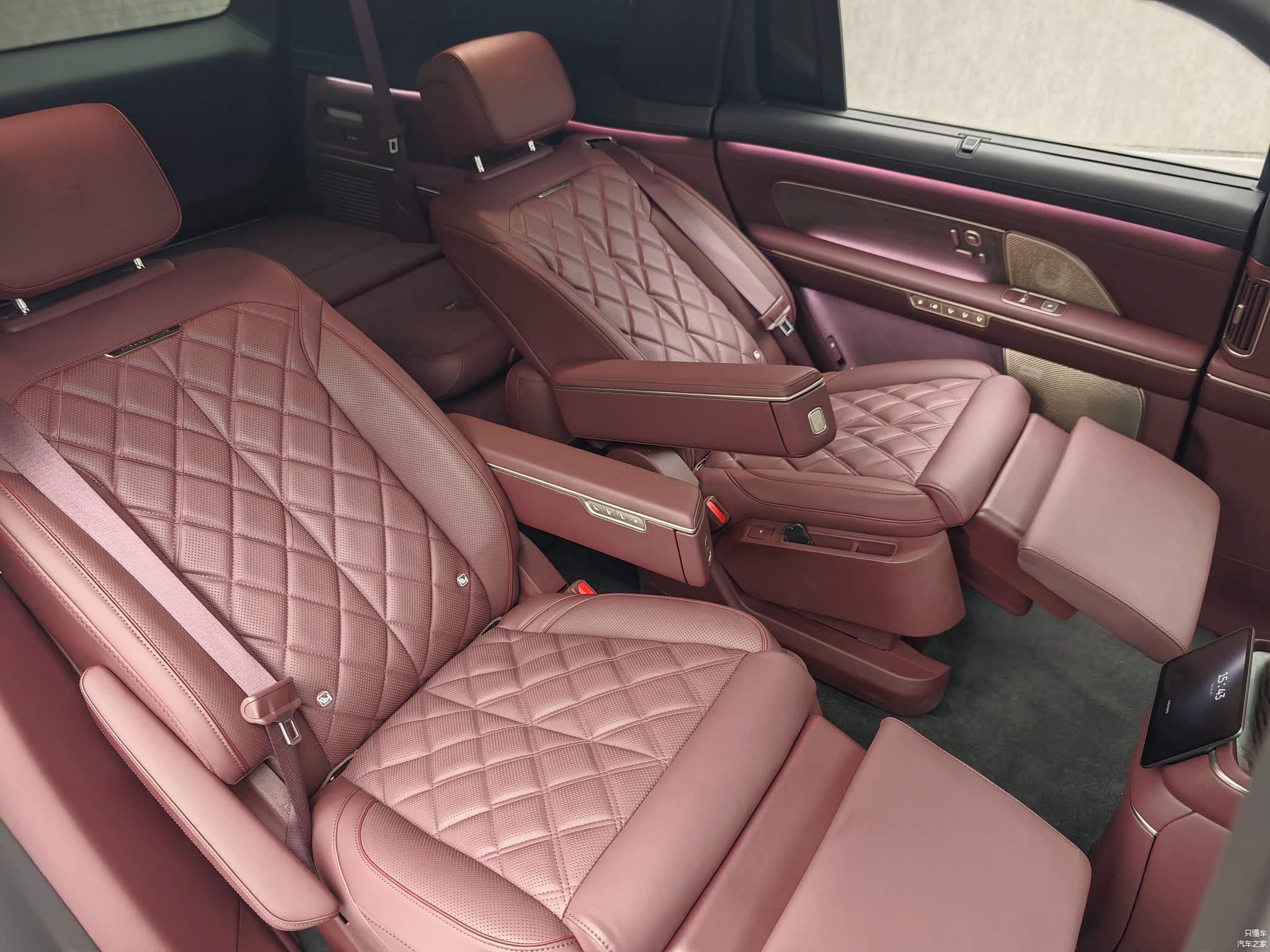 座舱座椅配置部分,副驾及二排标配3张零重力座椅,均支持22向电动调节+加热通风按摩,二排右侧零重力座椅支持150mm横向滑移,可以拉近与乘客的距离。第三排腿部空间可达850mm,支持靠背倾角可调至130°和一键电动放倒。并配备同级最大547升后备厢空间、230升超大感应式电动前备舱,6人12箱无压力。