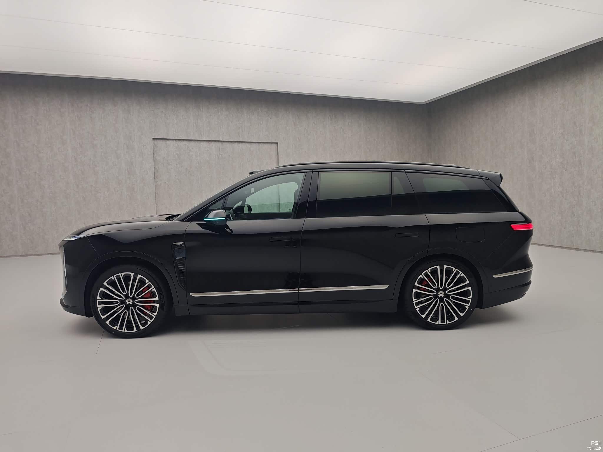 车身侧面变化不大,全新蔚来ES8造型非常修长,采用隐藏式水切设计,配备隐藏式门把手和22英寸轮毂和红色涂装卡钳,搭配倍耐力P-ZERO轮胎,轮胎规格为265/40R22。车身尺寸方面,全新蔚来ES8的长宽高分别为5280/2010/1800mm,轴距为3130mm。相比老款蔚来ES8,车身长度增加181mm,宽度增加21mm,高度增加50mm,轴距增加60mm,整车风阻系数做到了0.259Cd。