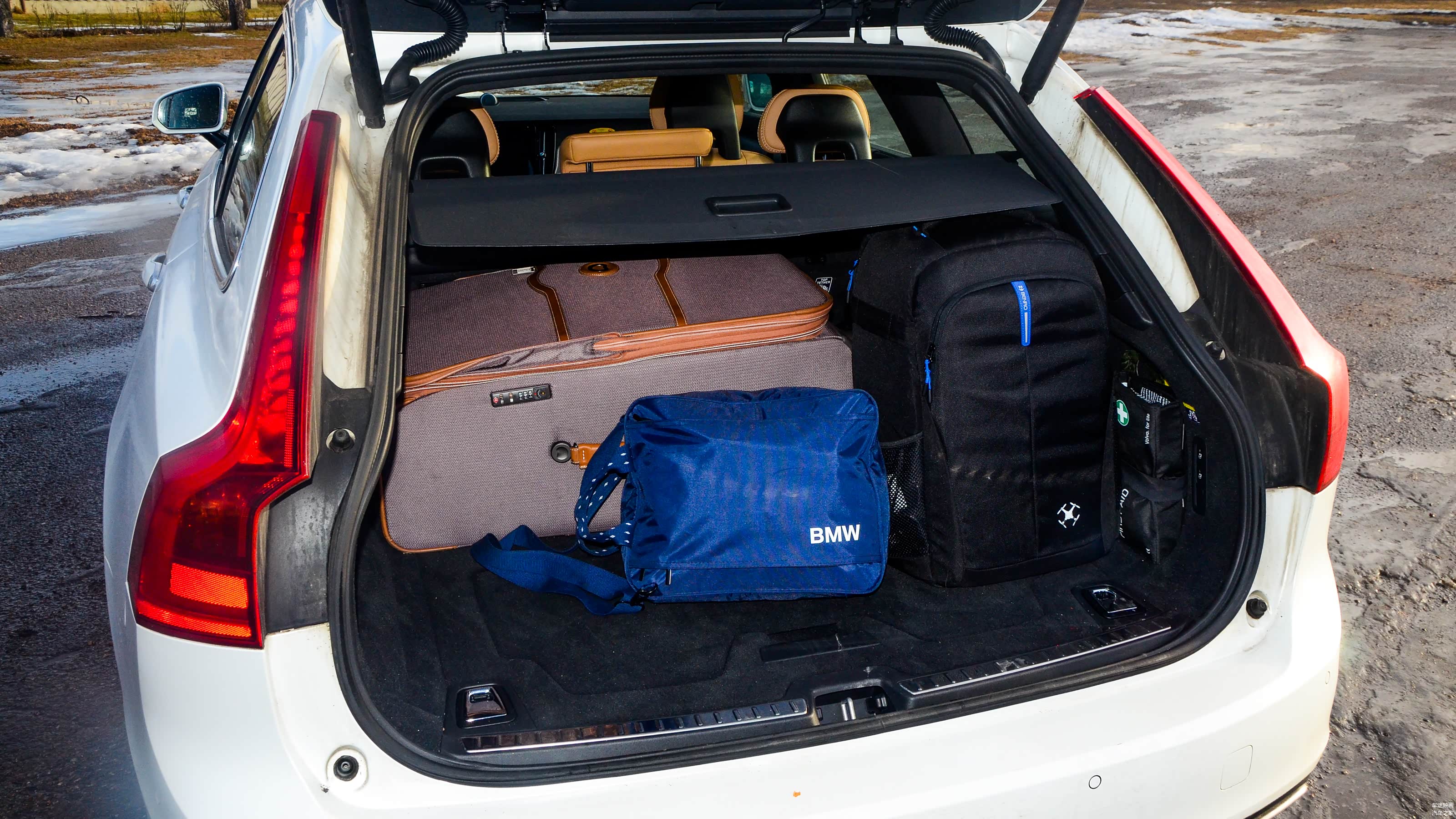 行李箱的长度与S90类似,一定的高度,可以将很多大件行李摞着放。但行李箱上下隔板的位置有点碍事儿,V90尾部的坡度,要比之前的V70系列大一些,装载能力还是受到了一定的影响。不过这一段路程,就我一个人驾驶,所以这些因素倒是无所谓了。如果是4个人的行李全都是30寸的大箱子,这种情况还是建议租一台XC90吧。
