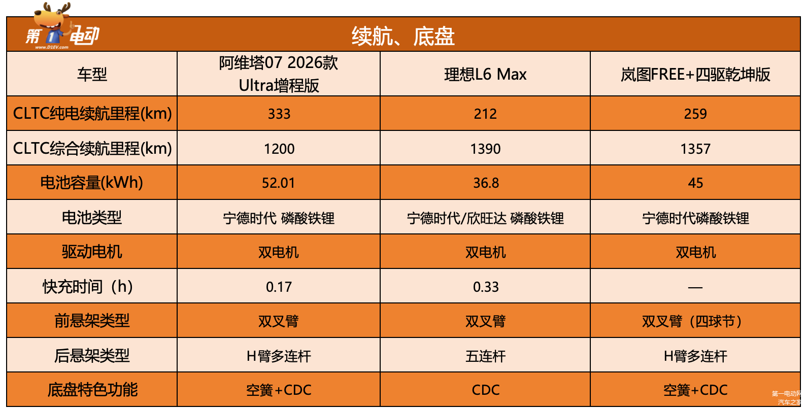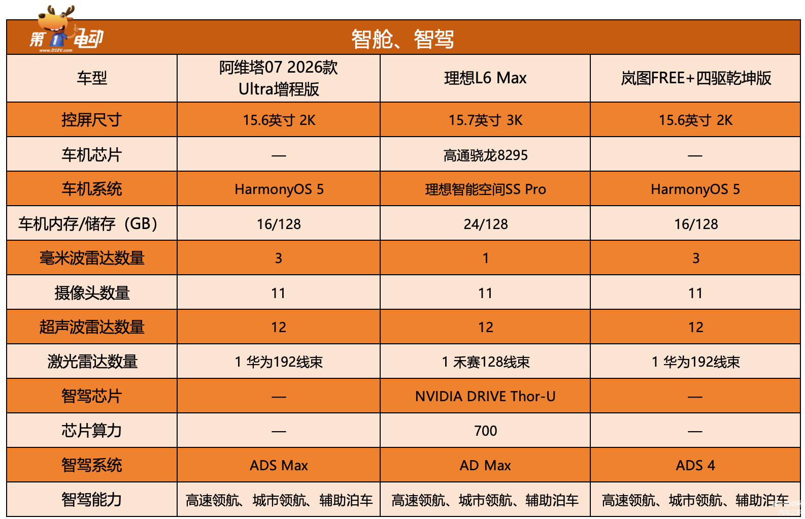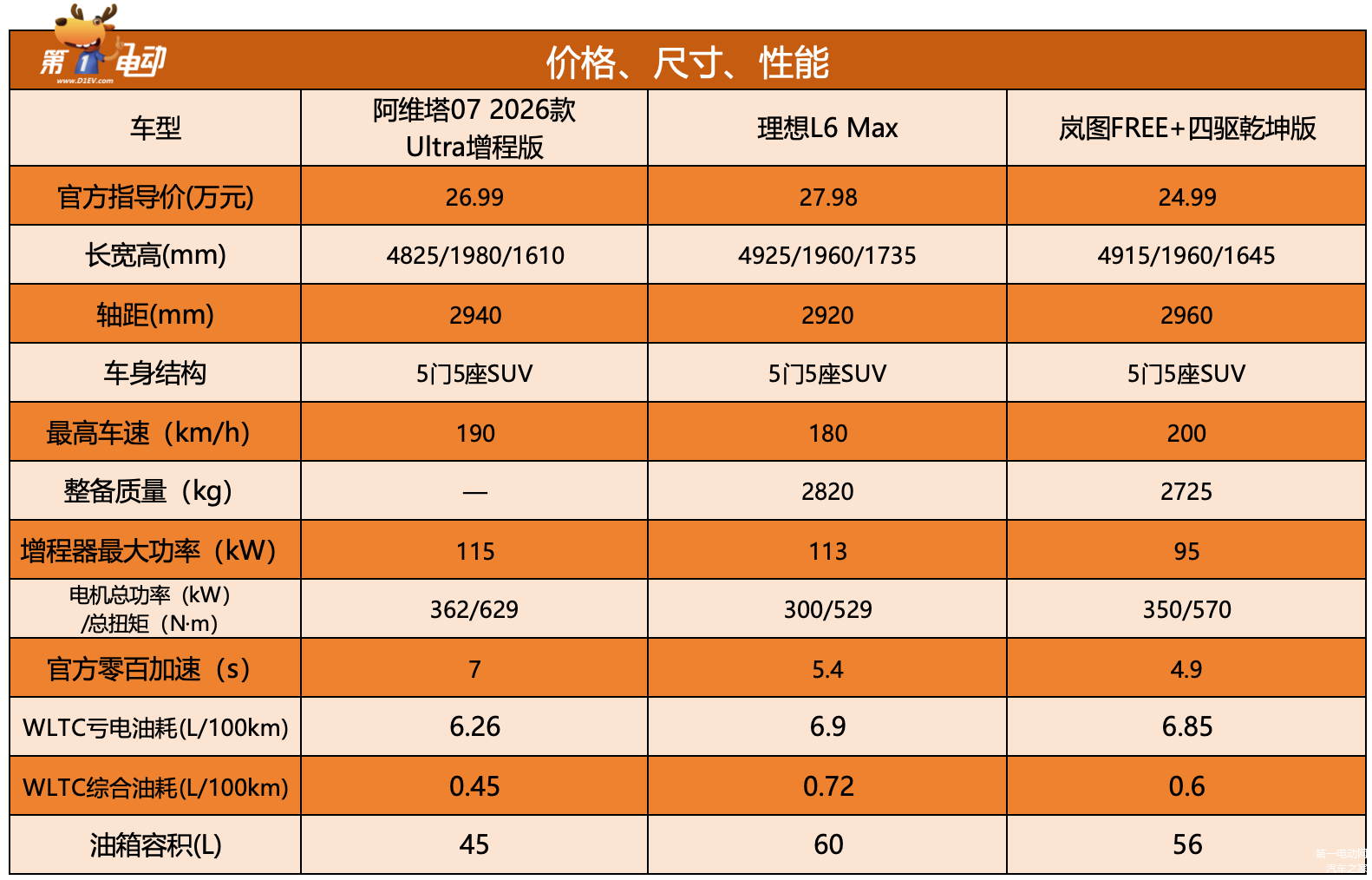为了方便参考各项指标,我们选择了当下热度较高的理想L6和岚图FREE+,并选取了三款车型的顶配版本作为对比。