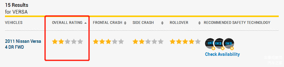 虽然这则报道小编暂时没有找到官方新闻证实,但是小编在美国高速公路安全管理局(NHTSA)官网上查到的美版阳光(VERSA)的碰撞测试成绩仅有两星的评价,在一批四五星为主的碰撞测试里显得很抢眼,这无疑也让国内的消费者对于阳光的安全性产生了很大的质疑。
