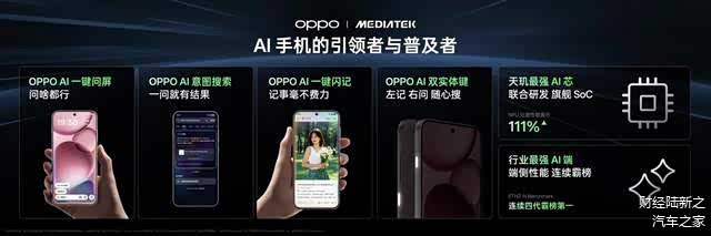 OPPO 作为 AI 手机领域的引领者与普及者,持续深耕系统级 AI 技术,先后推出 AI 一键问屏、AI 意图搜索、AI 一键闪记等功能,这些成果得益于 OPPO 与联发科联合研发的天玑 AI 芯强势驱动。新一代 Find X9 系列所搭载的天玑 9500,以 NPU 处理性能提升 111% 的超强算力,帮助 OPPO 打造行业性能最强 AI 端,并让 OPPO 旗舰成功在端侧AI 性能方面实现 ETHZ AI Benchmark 连续第四代霸榜第一,结合更流畅更智能的 ColorOS 16 系统,为用户带来新一代最强 AI 终端体验。