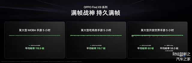 在主流 MOBA 手游中,Find X9系列轻松实现了最高帧率连续 5 小时满帧运行,稳定无波动;即使是在第三方进行的大型开放世界手游测试中,Find X9系列仍可实现最高帧率 5 小时全满帧运行,在复杂场景渲染、高频技能释放等场景下帧率始终稳定,为用户带来真正的“满帧自由”。与之相比,其他最新发布的旗舰手机,全程帧率表现波动更大,且未达到4小时便电量耗尽关机。