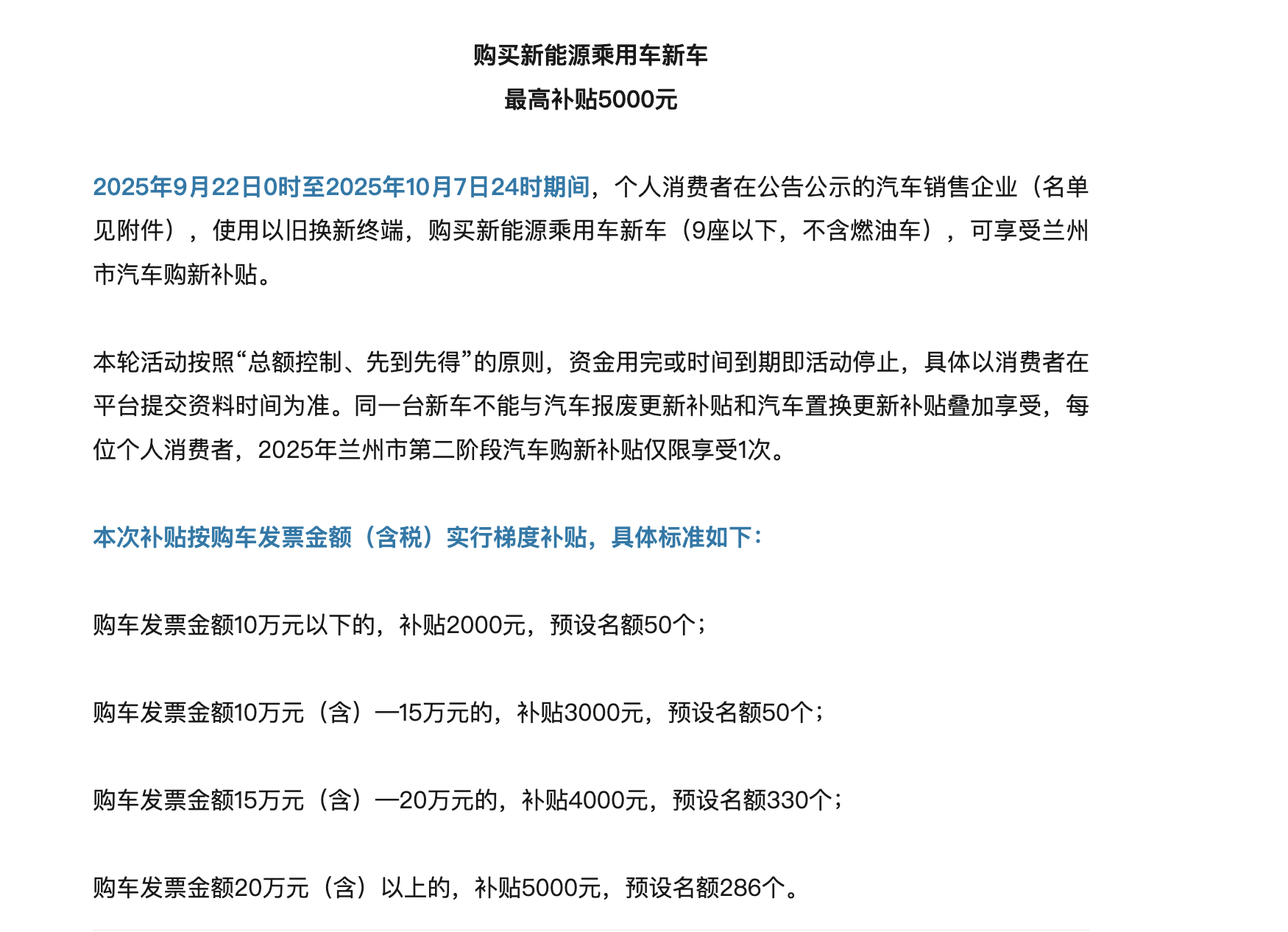 兰州也在近期启动了第二阶段汽车购新补贴活动,从9月22日至10月7日,个人消费者使用以旧换新终端购买新能源乘用车新车可享受兰州市汽车购新补贴,补贴标准从2000元到5000元不等,其中2000元补贴预设名额50个,5000元补贴档预设名额为286个。