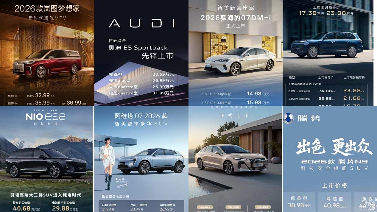 2026款岚图梦想家、比亚迪 海豹07 DM-i(图片 | 参数 | 询价)、上汽奥迪AUDI E5、享界S9T、比亚迪唐DM-i智驾版、吉利银河M9、奇瑞风云X3L、荣威M7 DMH、2026款腾势N9、全新深蓝S07、2026款阿维塔07、传祺向往S9、蔚来全新ES8、蔚来ET9地平线特别版、iCAR全新超级V23、新款莲花EMEYA、新款莲花ELETRE……