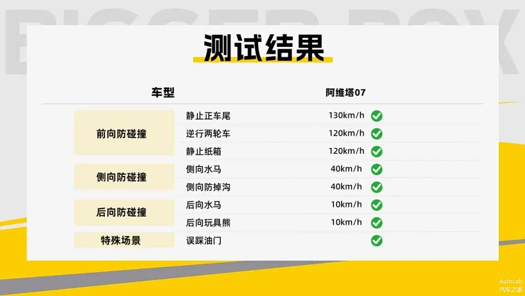 而阿维塔07现在面对纸箱这样的非常规障碍物也有反应,在120km/h的速度下可以触发AEB刹停。
