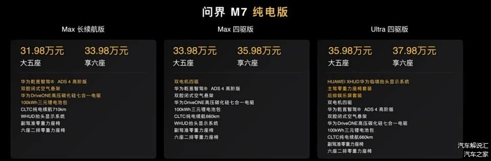 全新问界M7纯电版建议零售价为:问界M7纯电Max大五座长续航版31.98万元起,纯电Max享六座长续航版33.98万元起;纯电Max大五座四驱版33.98万元起,纯电Max享六座四驱版35.98万元起;纯电Ultra大五座四驱版35.98万元起,纯电Ultra享六座四驱版37.98万元起。