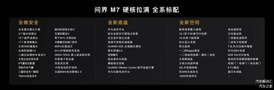 全新问界M7以超60项全系标配,包括激光雷达方案、华为乾崑智驾®ADS 4、华为途灵底盘、华为巨鲸电池平台等核心配置,涵盖全维安全、全能底盘、全新空间三大维度,硬核拉满全系标配,重塑国民SUV价值标准。