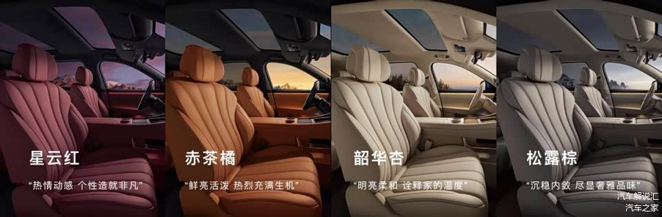 全新问界M7新增珊瑚红、海岛蓝与暖云白3款全新车色,珊瑚红配色采用纳米级透明红车漆与幻彩珠光工艺,质感出众;海岛蓝清澈明朗,唤醒度假般心境。此外,新车还提供牧野青、星际蓝与鎏金黑车色供用户选择。鎏金黑、暖云白、珊瑚红与海岛蓝车色可选装黑曜套件,包含黑曜车标、玄曜轮毂与黑曜饰条,更显年轻运动。内饰新增星云红配色,热情动感,彰显非凡个性;同时提供赤茶橘、韶华杏、琥珀棕多种内饰配色,满足用户不同审美需求。