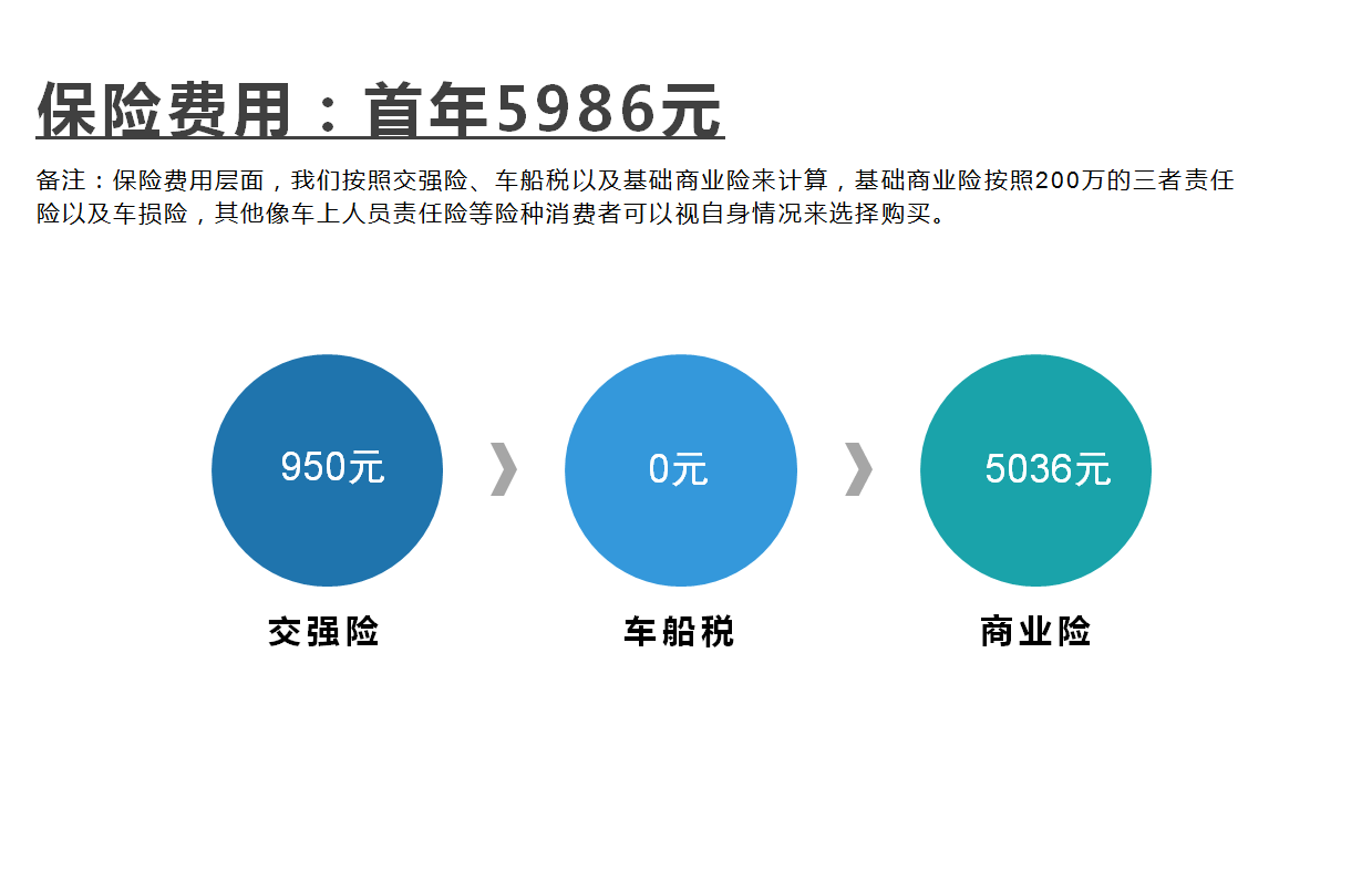 保险费用层面,我们按照交强险、车船税以及基础商业险来计算,基础商业险按照200万的三者责任险以及车损险,其他像车上人员责任险等额外险种消费者可以视自身情况来选择购买。另外,此价格也不考虑之后几年不出险的折扣以及保险公司的优惠等。