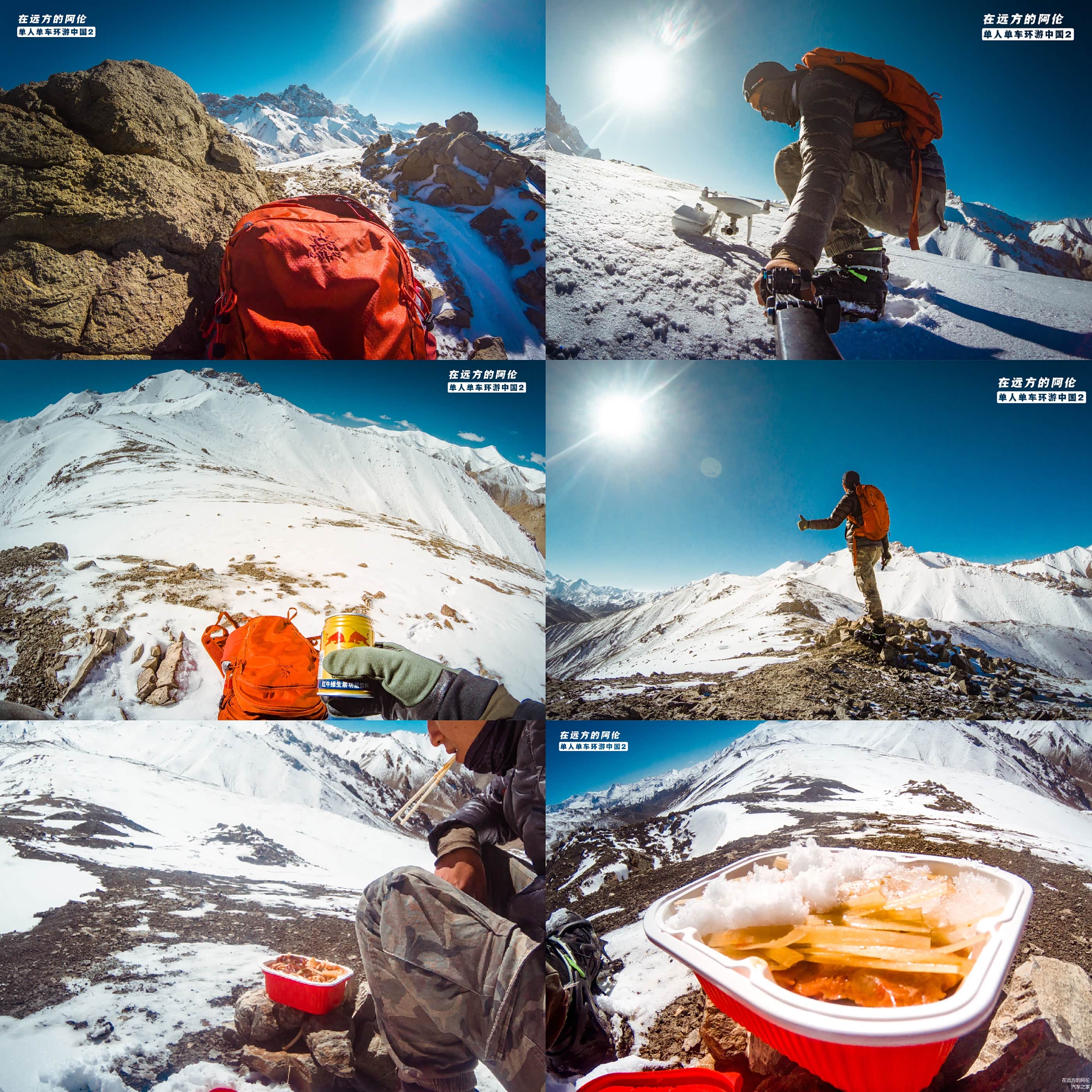 哈哈,往前在拉萨收到朋友寄过来的方便火锅还没吃完,看着这白雪皑皑的群山,不就是吃火锅的好地方嘛?我坐在一个小山丘上,抓来一把积雪,一口火辣的火锅,一口冰冷的雪花,体验着啥叫冰火两重天。