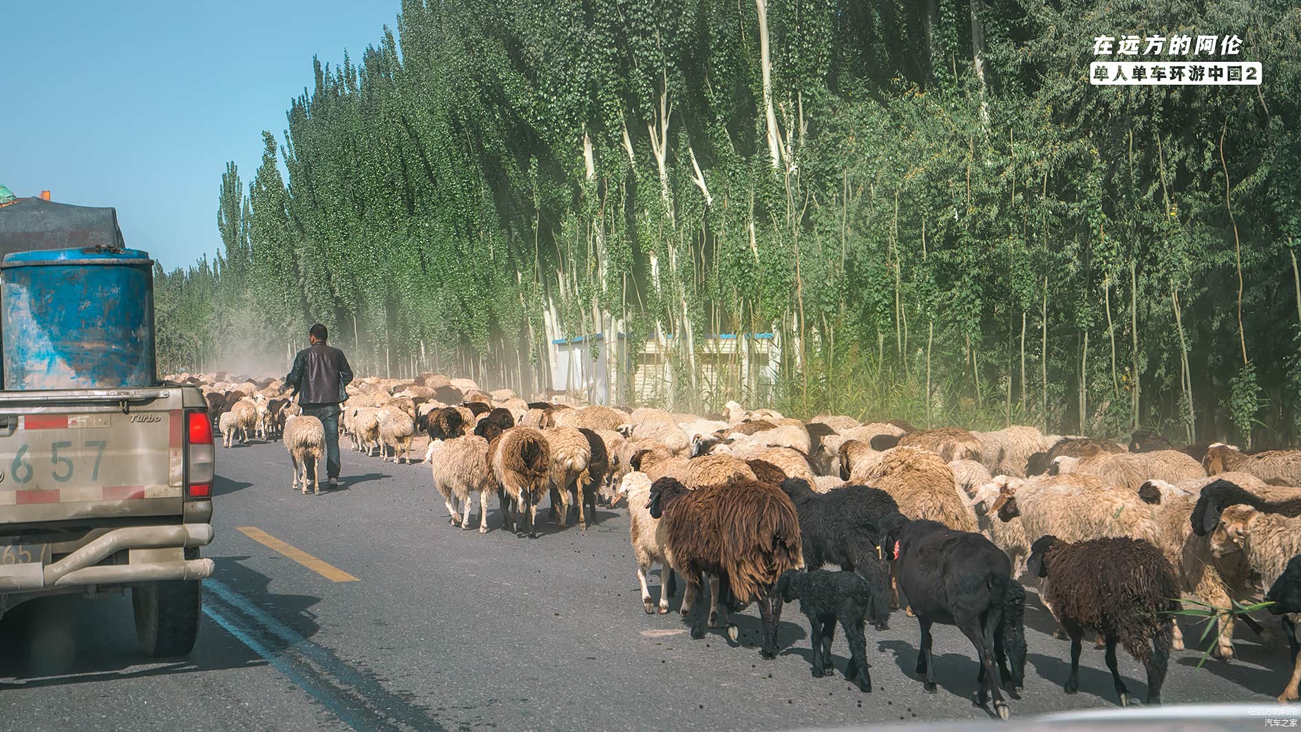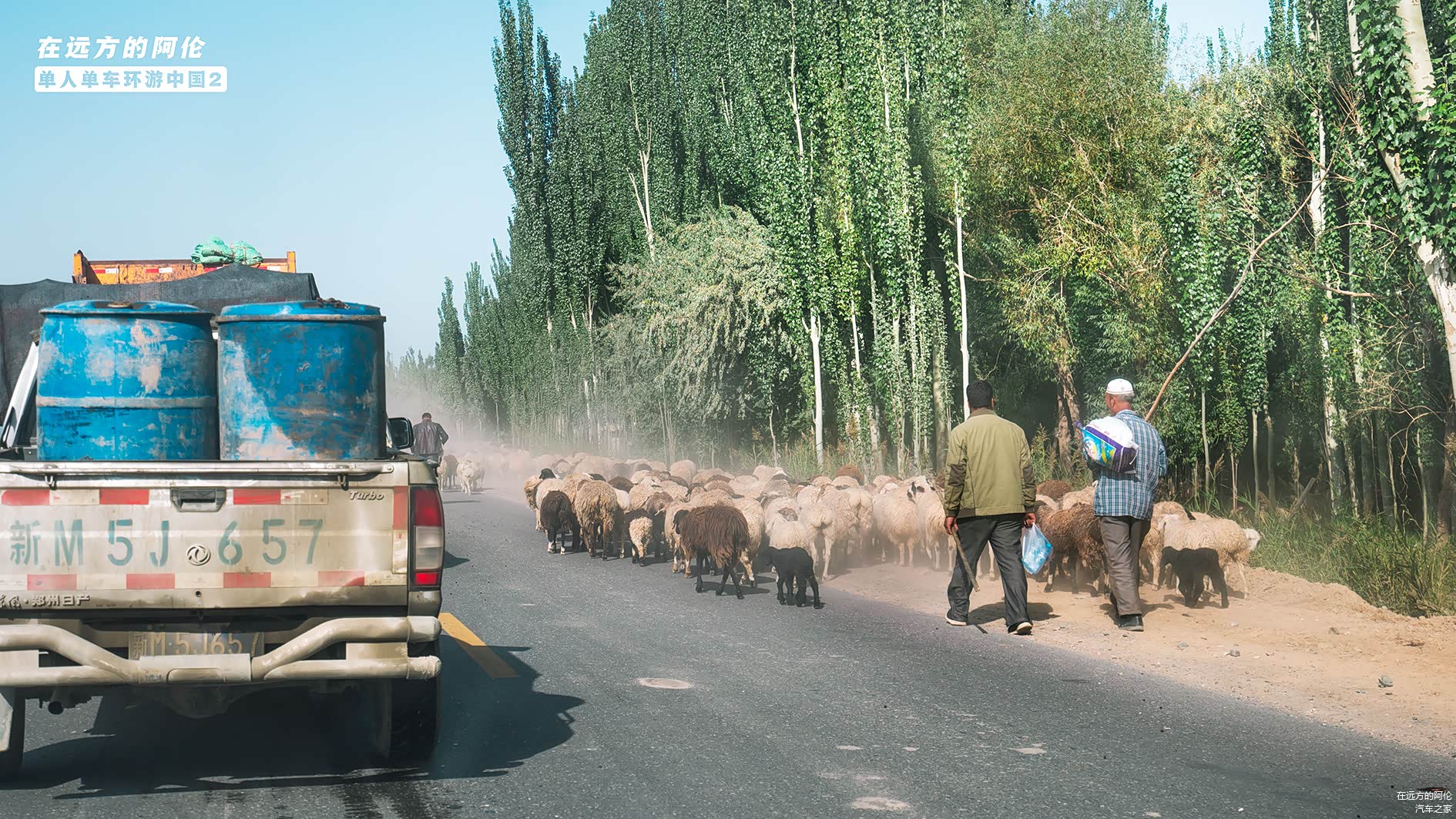 路过一个小村庄后看到风尘仆仆的羊群,只是这放羊的已不是藏族同胞,而是维族同胞。