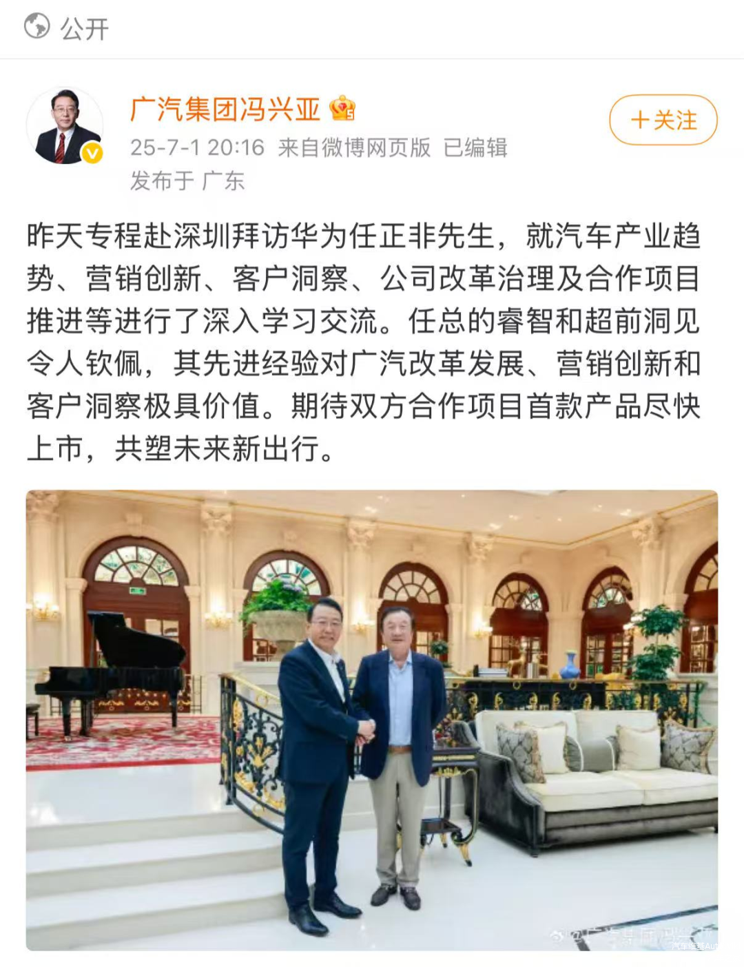 此次高层共同站台并非孤立事件,而是双方战略共识持续深化的结果。早在今年6月,广汽集团董事长冯兴亚便赴深圳与华为创始人任正非进行了深入交流,双方就汽车产业趋势、营销创新与用户洞察等战略层面交换意见。这次顶尖企业家之间的对话,为后续的合作奠定了高规格的战略基调,明确了共同打造高端智能品牌的方向。