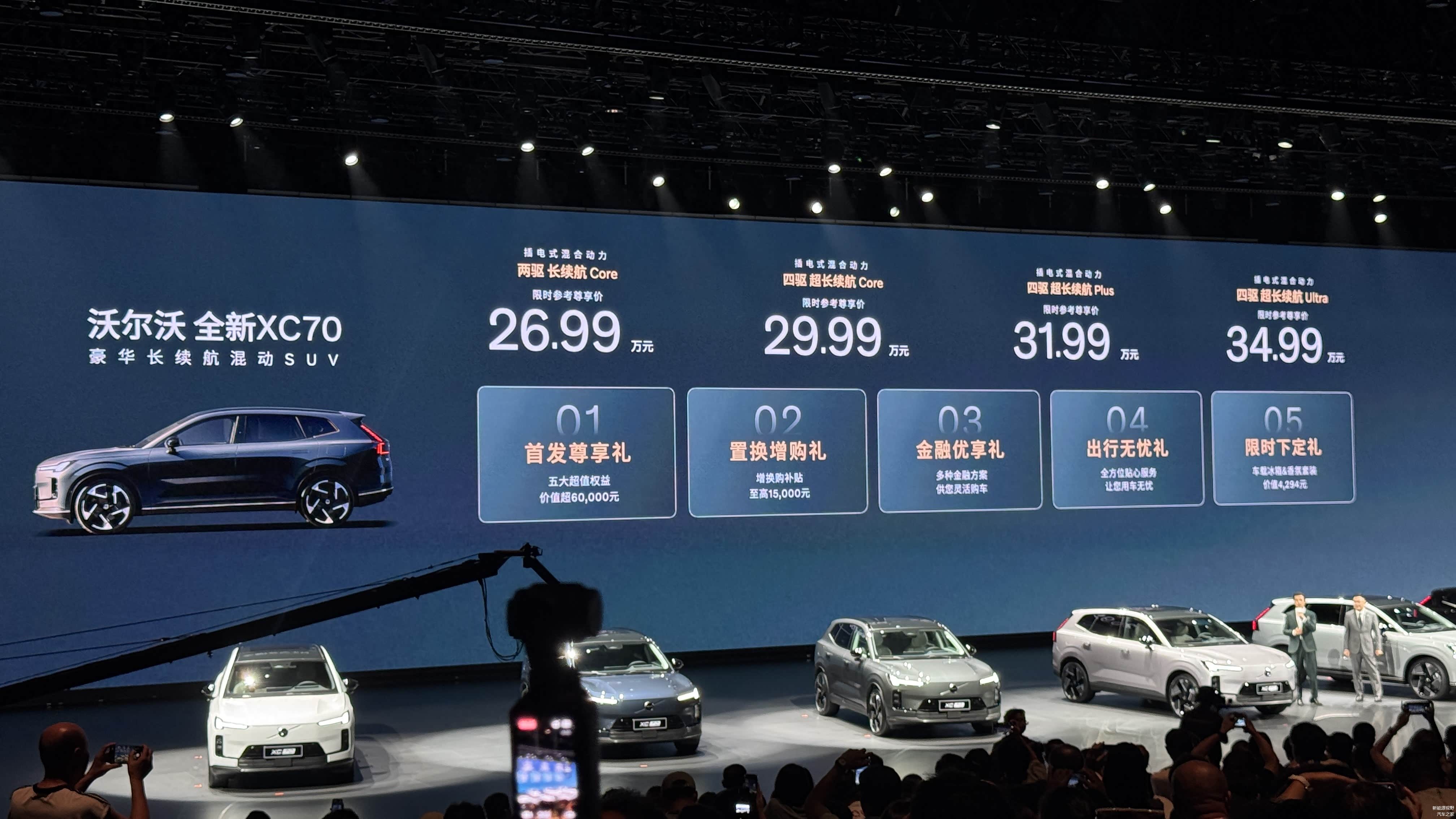 2025年9月26日沃尔沃XC70正式上市,新车共发布4款车型,指导售价41.69万元--49.69万元,限时参考尊享价26.99万元--34.99万元。动力上,搭载1.5T插混系统,综合最大续航超过1200km。