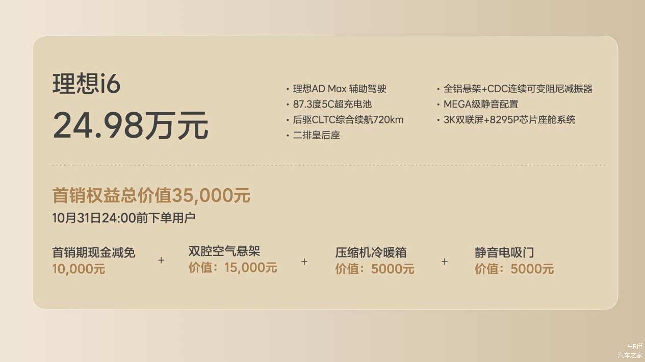 即日起,理想i6可以通过理想汽车官网或理想汽车App进行订购。2025年10月31日24:00前确认订购的理想i6用户,将享受10,000元的现金减免权益,以及双腔魔毯空气悬架、智能冷暖双用冰箱、全车静音电吸门的免费赠送权益,限时首销权益可与其他权益叠加使用。