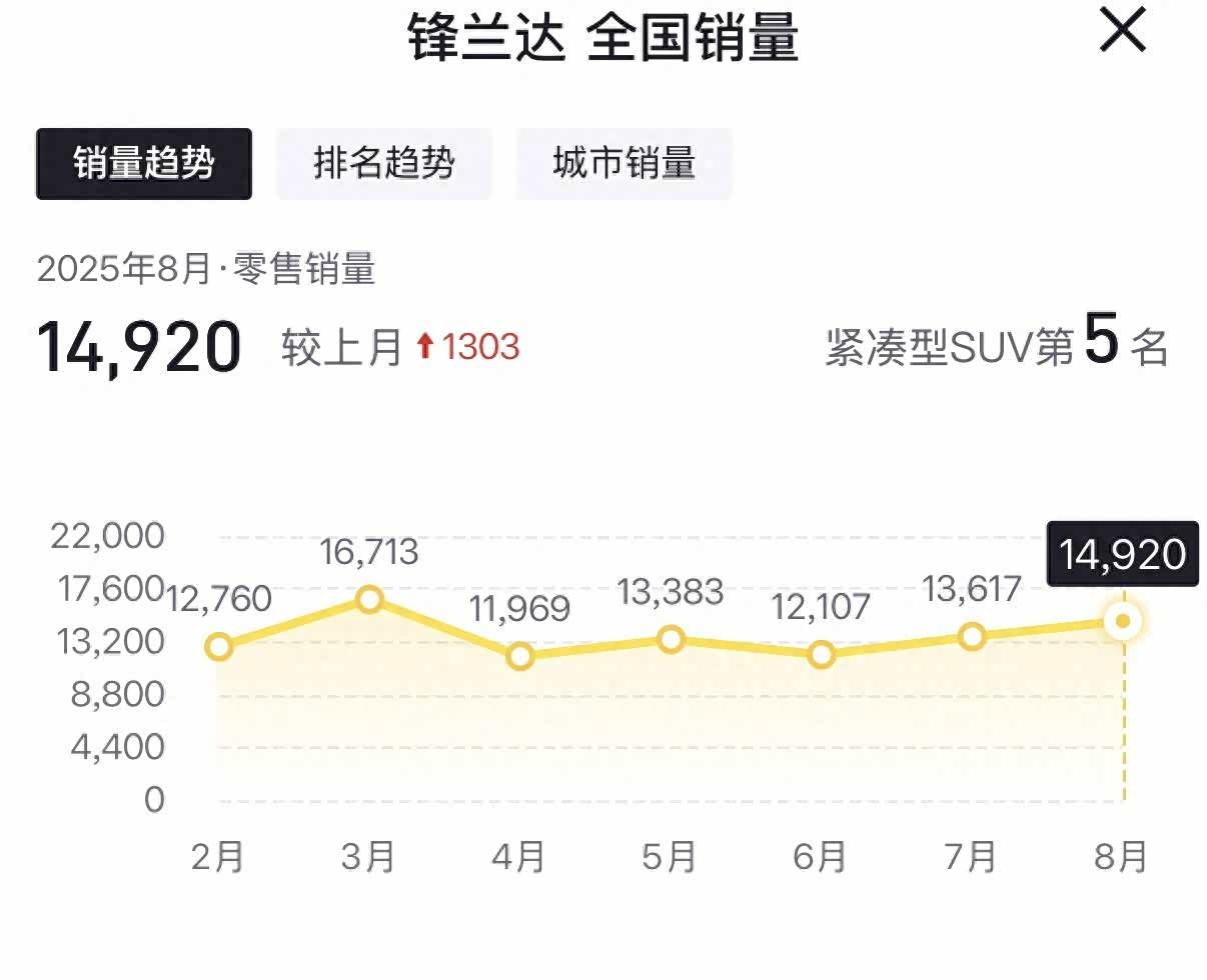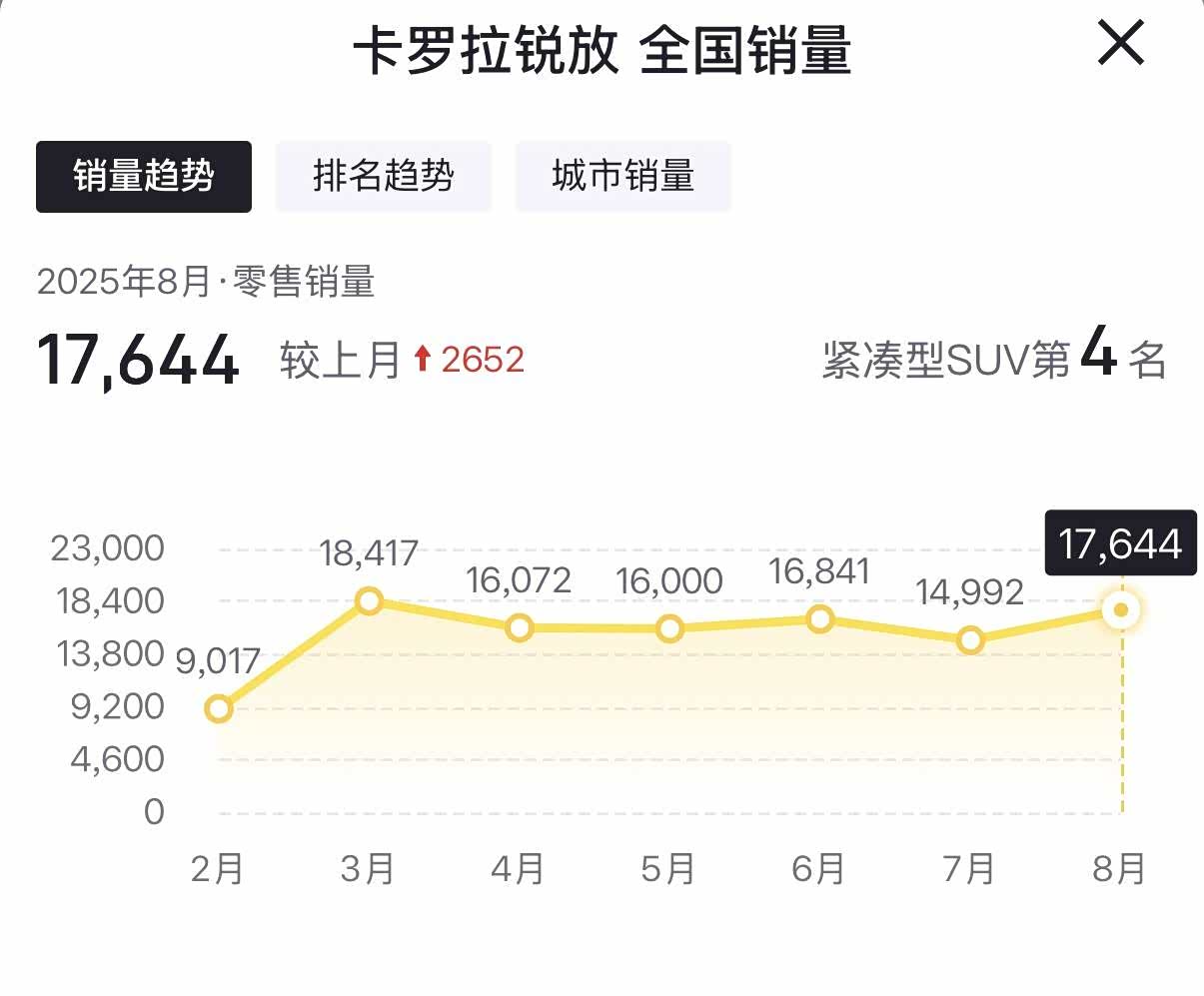 紧凑型SUV在国内一直是具备高购买率的细分市场。特别是丰田,虽然现在在网络上没赢过,但终端市场从来不会输过。拿广汽丰田 锋兰达(图片 | 参数 | 询价)来说,近半年销量为8.27万台;而且你要知道,它跟一汽丰田卡罗拉锐放理论上是两个厂商的同一台车型,加起来半年销量超18.26万台,月销都有32564台。
