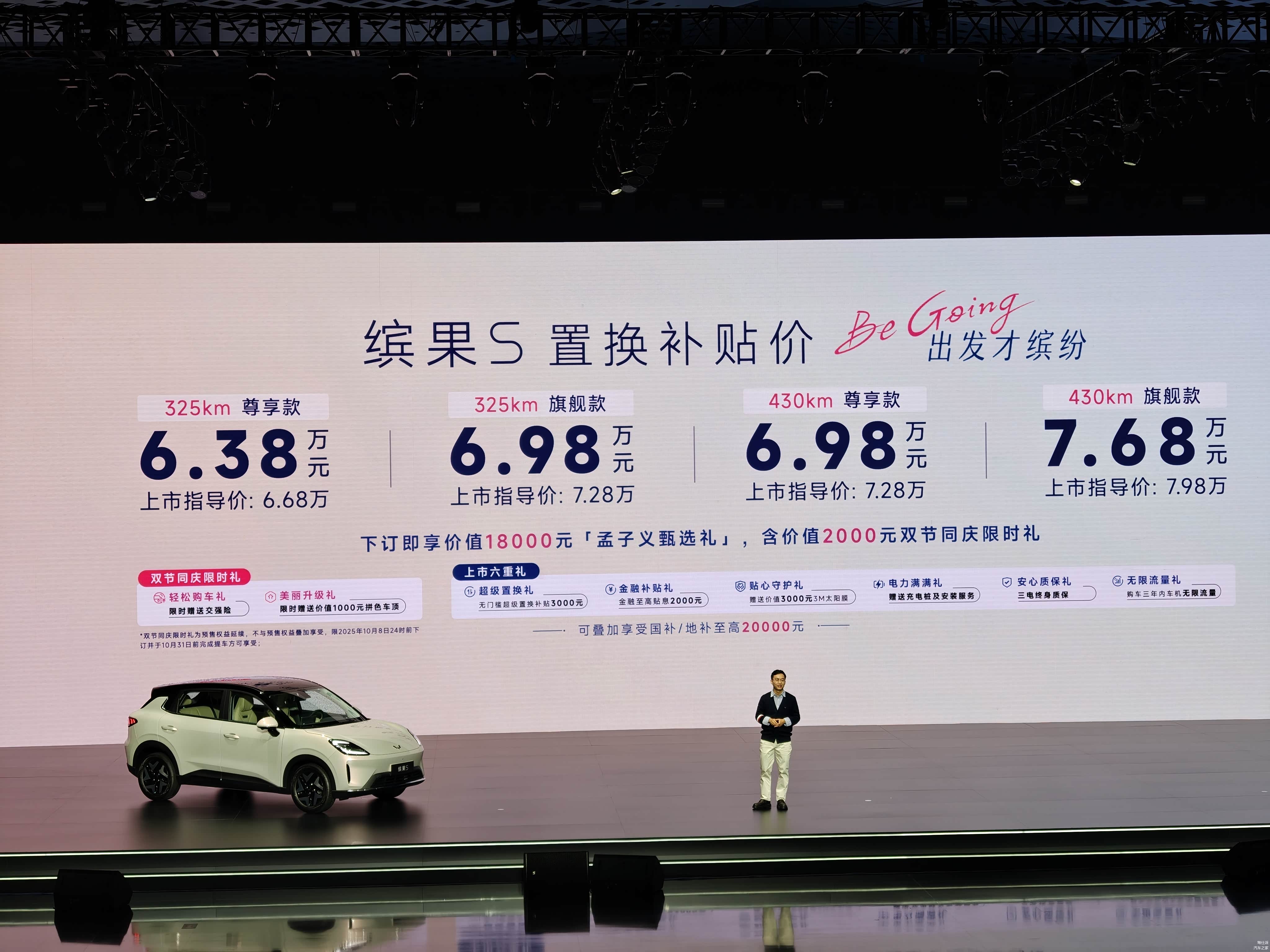 缤果S的指导价是6.68-7.98万元,此外上汽通用五菱额外给出了3000元的置换补贴,10月8日前还有1000元交强险赠送,算下来大概就是6.28-7.58万元左右,比缤果还便宜。还赠送了包括3M贴膜、三电终身质保、甚至现在很多车企都不送的充电桩,性价比拉满。