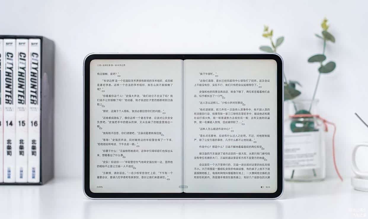 因为采用高精度纳米蚀刻技术,它可以减少97%环境干扰,有效地防止眩光,让阅读可以更加专注。从我们实拍的照片你也可以看到,在我们的摄影灯之下,它所显示的电子书内容,也是看不到日常那些烦人的光干扰的。柔光屏另一个优点是比普通屏幕更加耐磨,书写体验也更好,不像平时戳玻璃那么出戏,更容易进入专注的心流状态。
