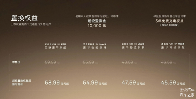 极氪9X的售价区间,45.59万到58.99万,这意思很明显,就是想吃点问界M9的市场,但是又怕自己干不过,所以,价格上还是比问界M9低了些。一句话总结就是极氪9X的配置产品力对得起这个价格,但是品牌力和认可度能不能匹配这个价格,就值得商榷了。