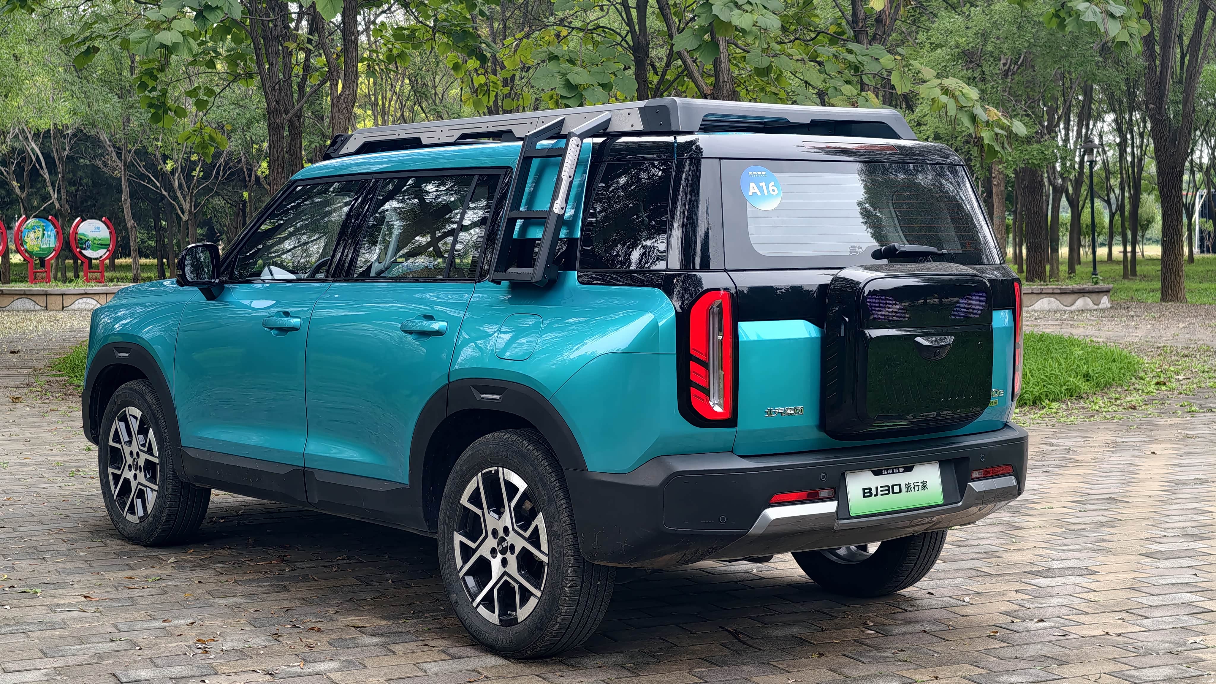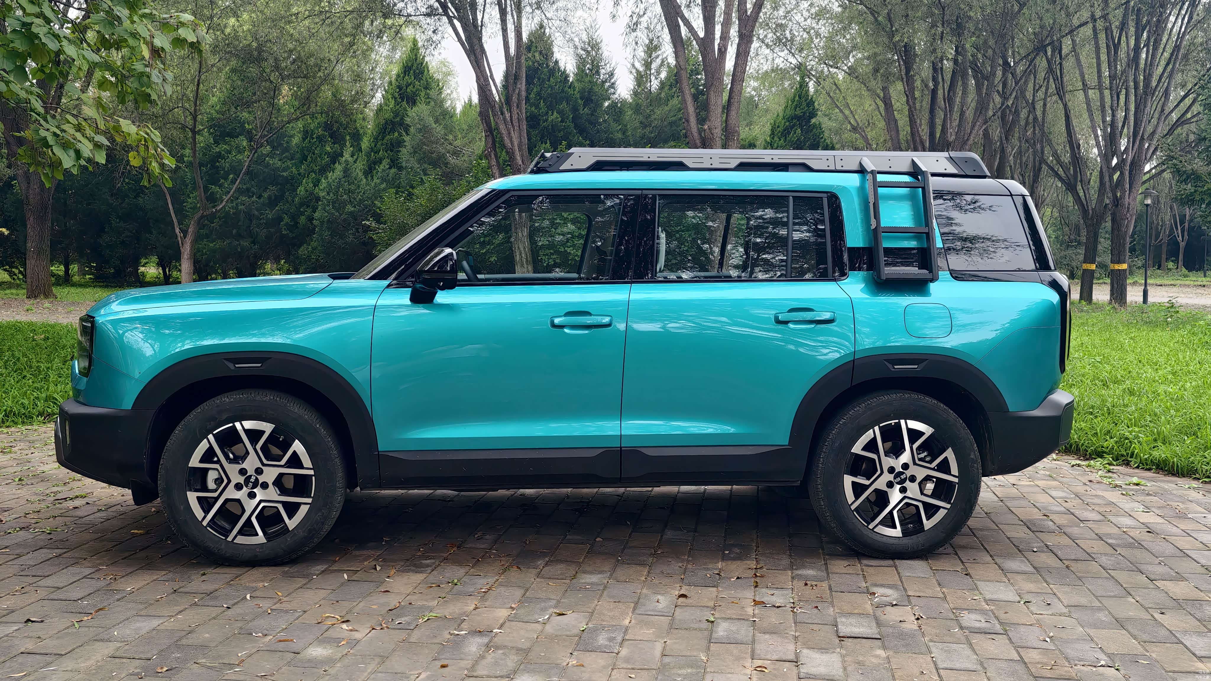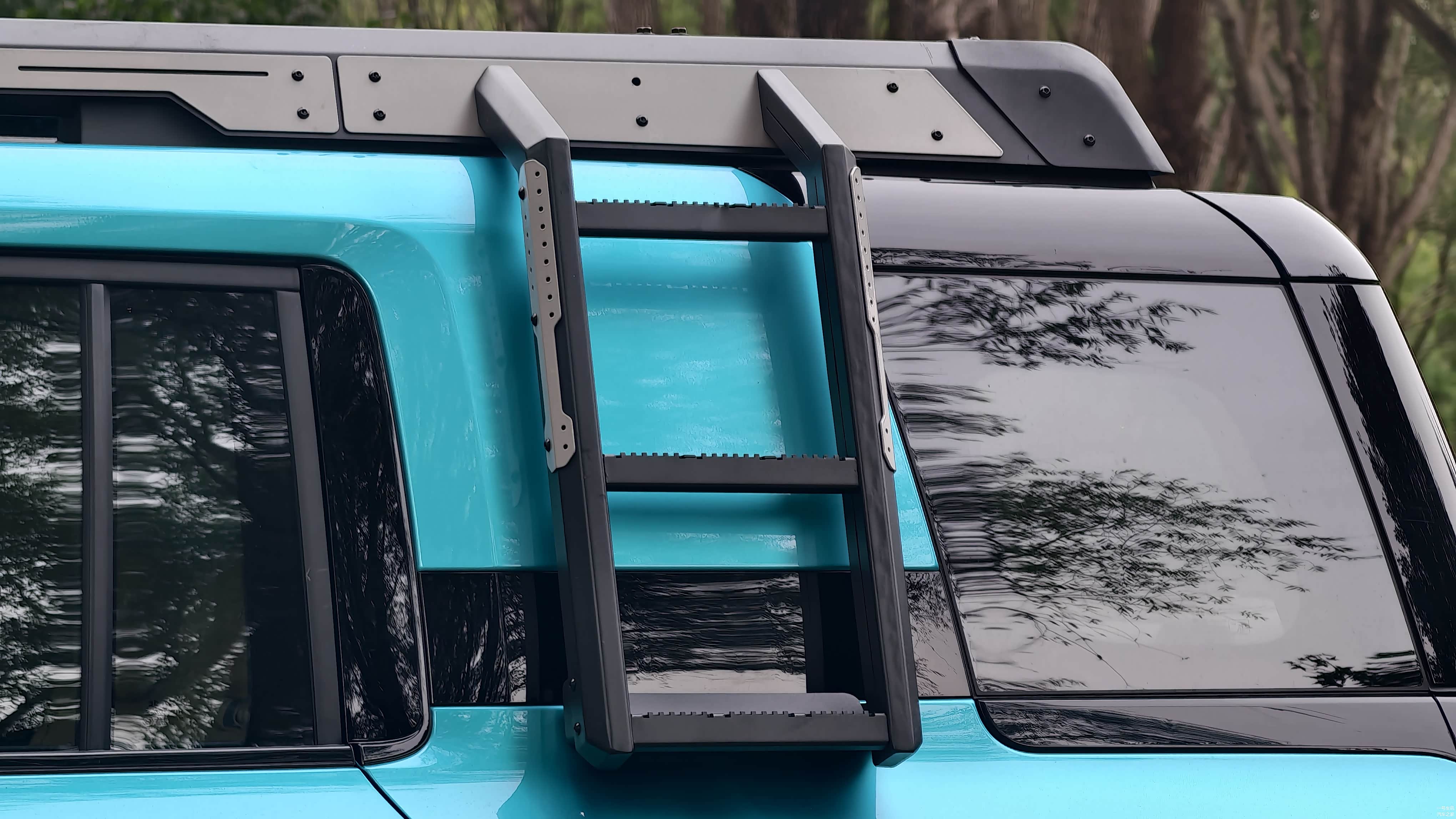 关于侧爬梯的设计,我特别偏爱其中两个小细节:一个是可以选择安装的侧爬梯,这真的非常吸引人。此外,这款车的轮毂也值得一提,尽管它的设计风格偏向于硬朗派,但这种轮毂确实更偏向于动感设计。从车尾的设计来看,它呈现出一种非常坚硬的外观,配有垂直的尾灯和众多的黑色装饰板,这都展现了它车尾的沉稳与厚重。