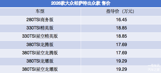 在9月29日,我从上汽大众的官方渠道了解到,2026款 大众帕萨特(图片 | 参数 | 询价)的出众款已经正式推向市场,总共推出了7种不同的车型,其官方推荐的售价范围在16.45万至19.29万元之间。作为年度更新版本,2026款大众帕萨特继续推出1.4T(280TSI)、2.0T(330TSI)和高功率2.0T(380TSI)的动力版本,并且其定价维持稳定。