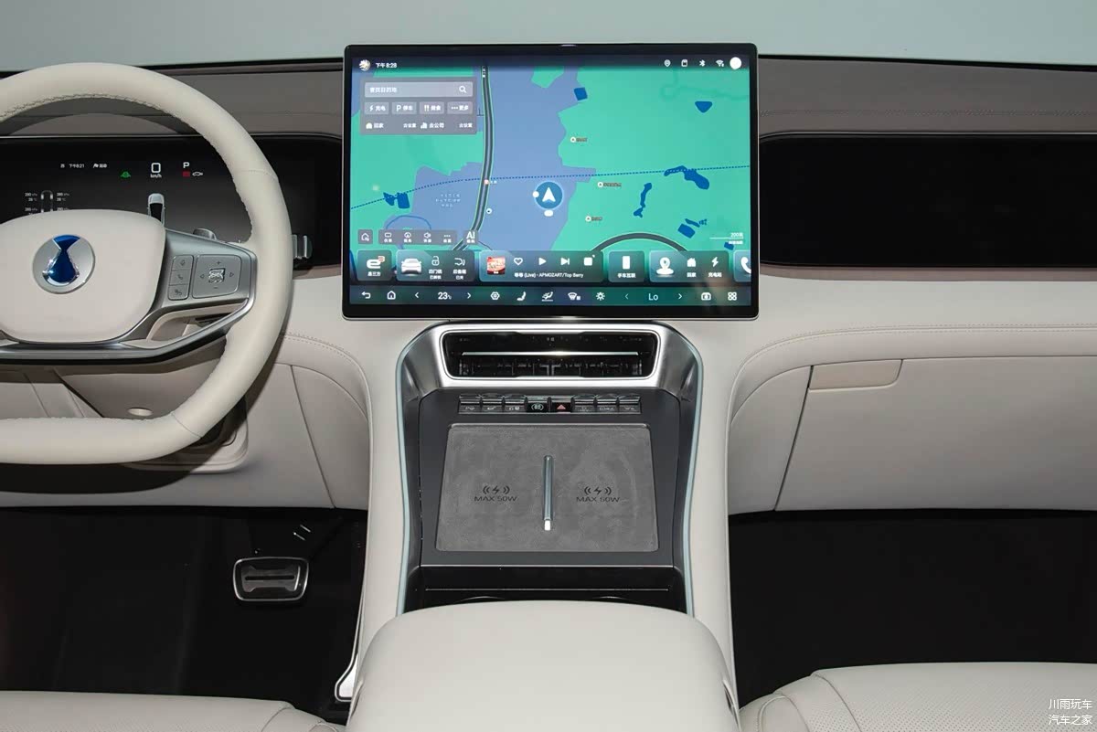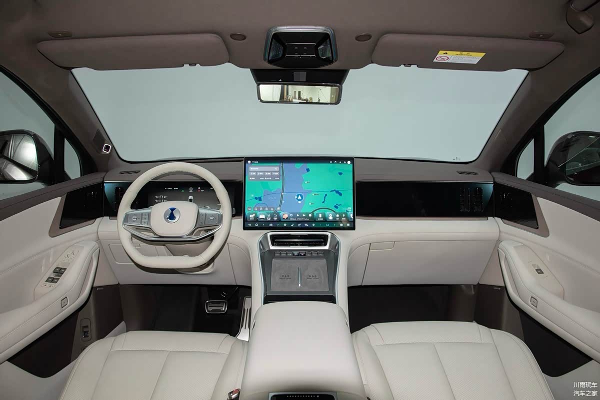 坐进车内,腾势N8L布局简洁,更像是传统豪华SUV的设计理念,多在强调高级用料,以及大面积的软性包裹。另外,还有织绒面料的顶棚也是比较有高级感。不过,虽然车机功能比较全面,但13.2寸副驾拓展屏给人的感觉还是有些怪异。至少以我的身高坐在副驾驶想要看这块屏幕,总觉得要把脖子往下压。至于50英寸AR-HUD +13.2寸仪表屏+17.3寸中控屏等组成的多屏联动,倒是兼顾了实用性,也在无形中提升了安全性。