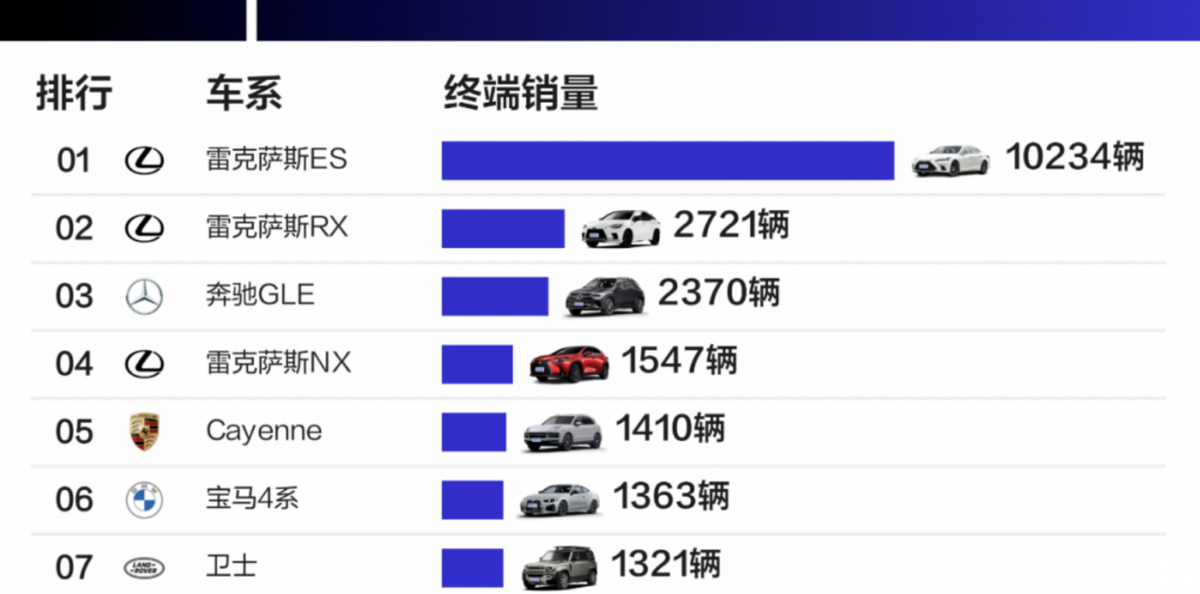 除此之外,奔驰GLE售出了2370辆,宝马4系是1363辆,而保时捷卡宴和帕拉梅拉分别为1410辆和1054辆,还有丰田埃尔法也售出652辆新车。如果从年度累计销量看,雷克萨斯ES依然是销冠,其次就是雷克萨斯RX和奔驰GLE。