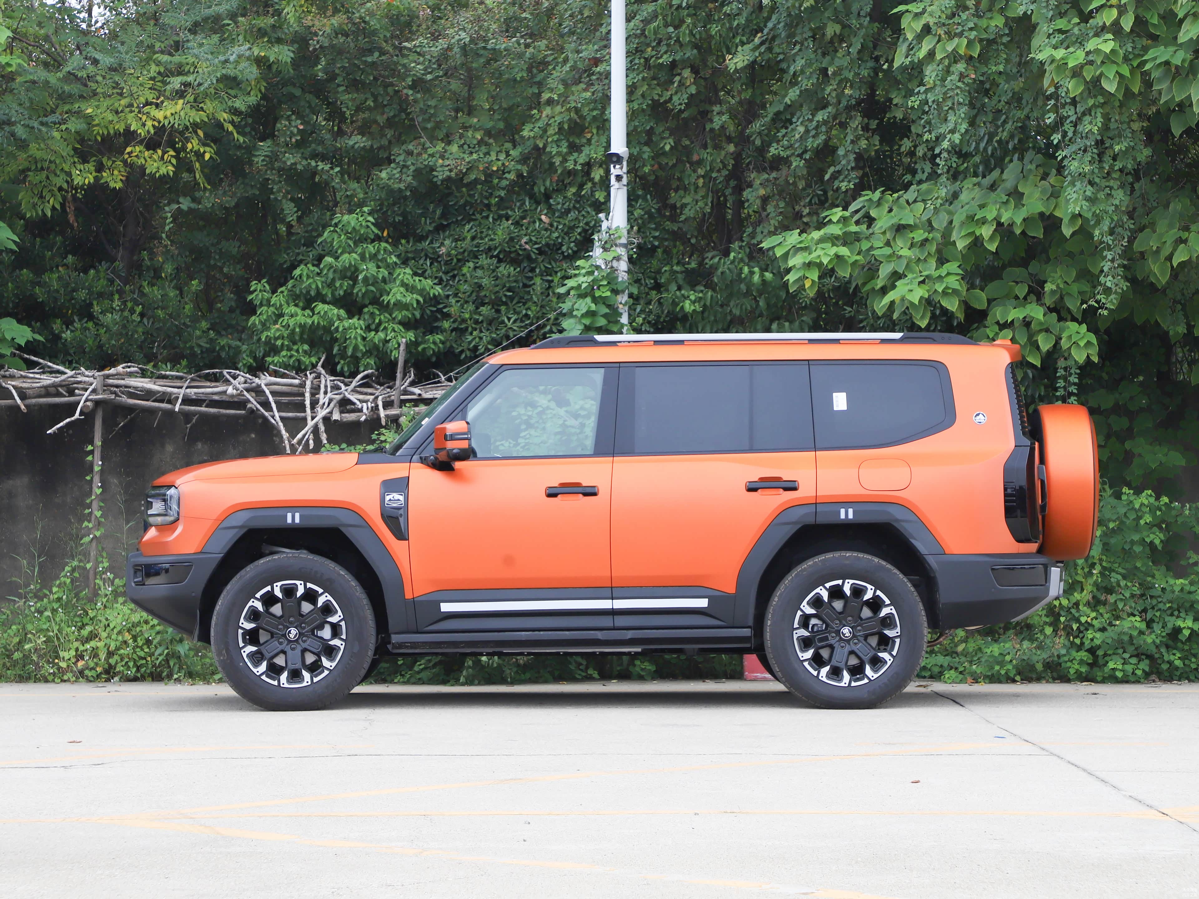 在车身的侧面设计上,车顶的线条显得相当直线,搭配了粗大的行李架,给人一种强烈的力量感。整体车身造型也相当规整,这是硬派风格SUV中常见的设计元素;车身的腰线设计采用了分段方式,为车身的侧面增添了丰富的层次感;轮眉与侧裙的设计融入了粗犷的黑色装饰板,这进一步加强了其硬朗的风格;轮毂的设计采纳了五辐式的熏黑风格,整体给人一种大气的感觉。