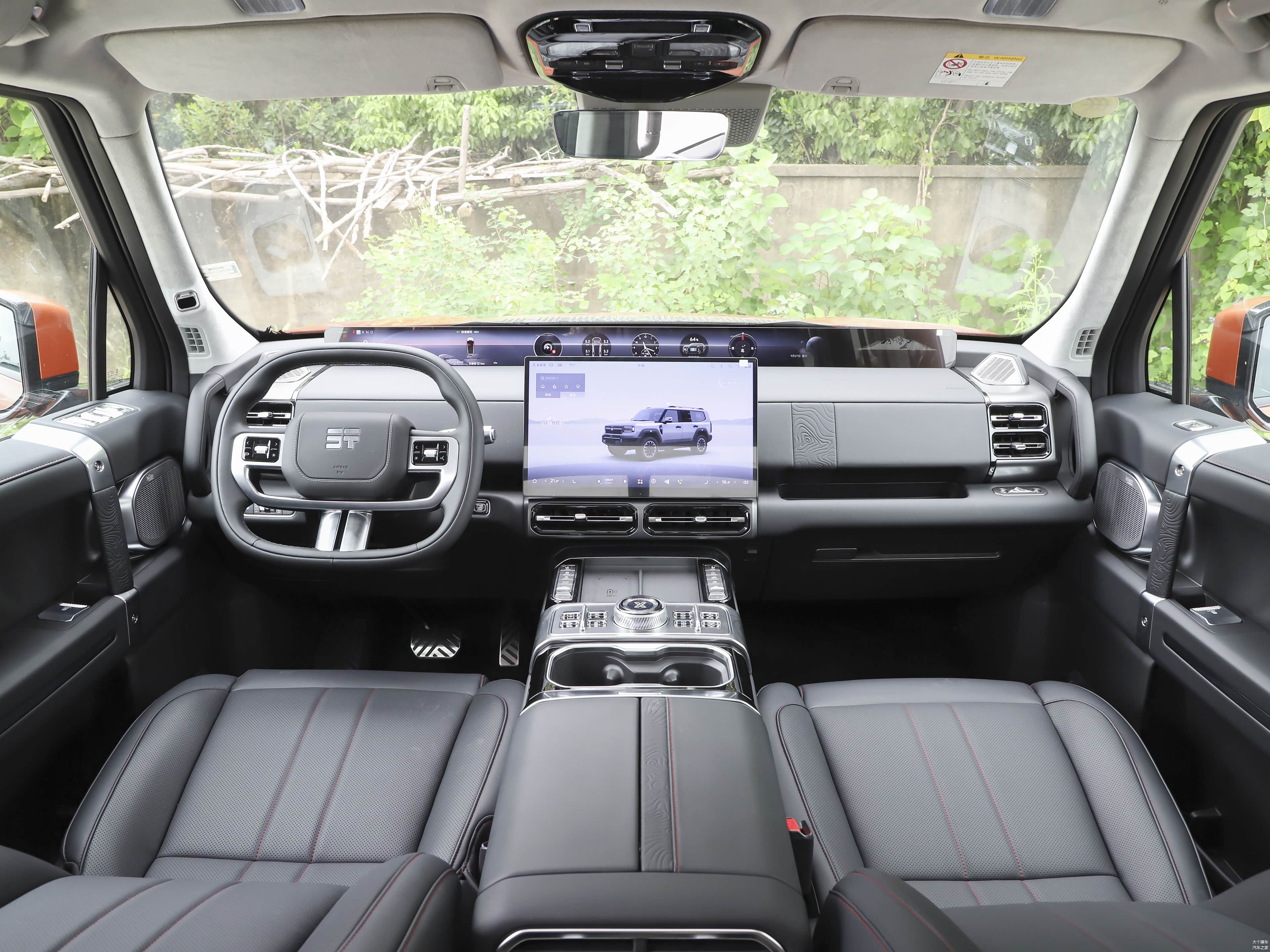 在内饰设计上,线条显得非常硬朗,配备了三幅式多功能方向盘、贯穿整个中控台的远端屏、悬浮式中控屏和电子怀挡。操作台部分还保留了实体旋钮,并且提供了无线充电区域。