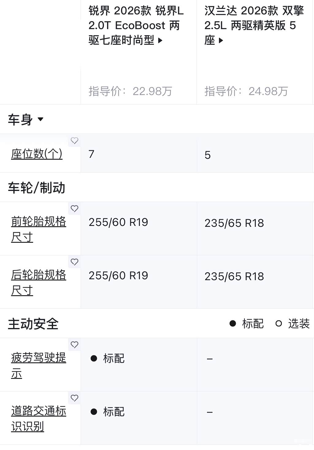 锐界L入门款时尚型,新增了智行驾驶辅助系统,这也就代表着26款锐界L全系车型都开始支持L2级驾驶辅助系统,汉兰达虽然也全系标配L2,但是像是疲劳驾驶提示、道路交通标志识别等进阶配置是没有的。而且锐界L可是全系标配7座模式,并且起步就是19寸的轮胎轮毂。汉兰达入门款依旧是5座模式,18寸的轮毂,所以说新款有进步,但仍有些遗憾。