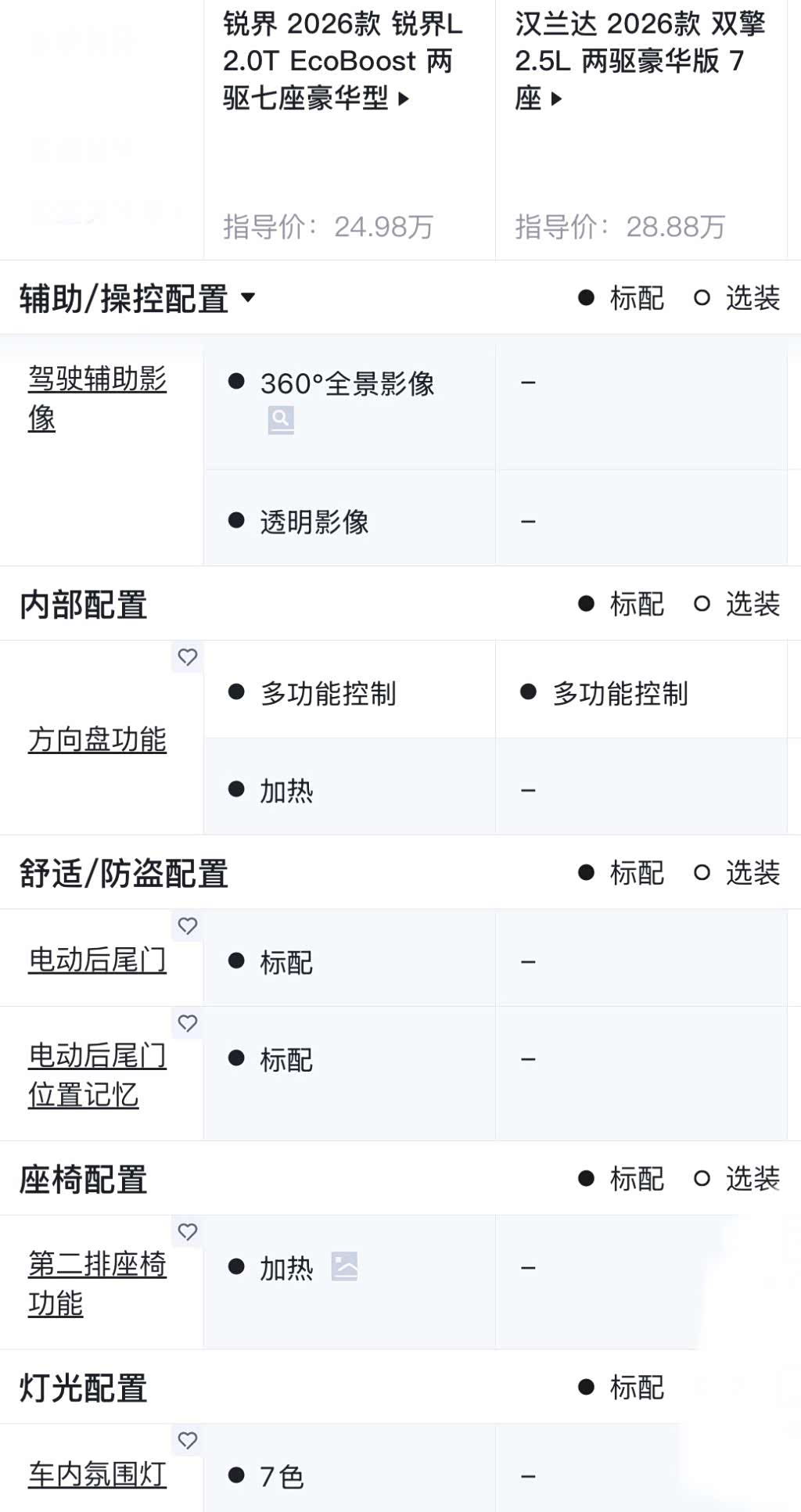 中配豪华型起,锐界L新增了方向盘加热和后排座椅加热,以及陡坡路况自动开启540度透明座舱的功能,舒适性和安全性都有了不小的进步。中配的汉兰达配置也有所提升,但是上面提到的中配锐界L所新增的功能,汉兰达只有在高配车型上才有前排座椅通风加热+二排座椅加热。而且像是带位置记忆功能的电尾门,氛围灯等很有仪式感的配置,日系车也一直不怎么重视,所以并没有配备。