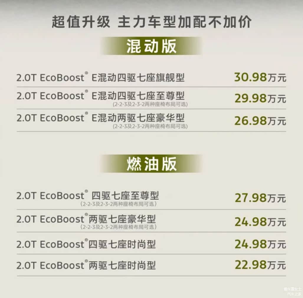 两款车都很热门,本次改款,实力提升也都很明显。那么极限二选一,谁才是更优解呢?我们今天就拿指导价都是30.98万的2026款锐界L2.0T EcoBoost®E混动四驱七座旗舰型(下文简称为锐界L)和2026款汉兰达双擎 2.5L四驱尊贵版7座(下文简称为汉兰达)做一个深入对比。