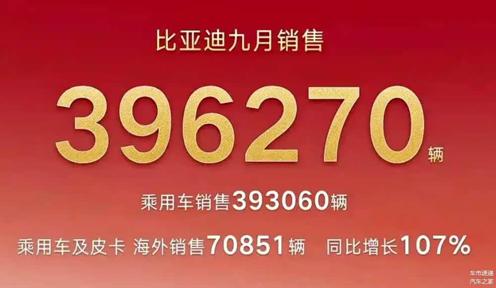 根据公开的销售数据显示,在刚刚过去的9月份,比亚迪单月销量高达396270台,其中,乘用车销售393060台,海外乘用车及皮卡销售70851辆,同比增长107%。今年1-9月比亚迪累计销量超过326万台,累计同比增长18.64%,乘用车及皮卡海外累计销量701579台。