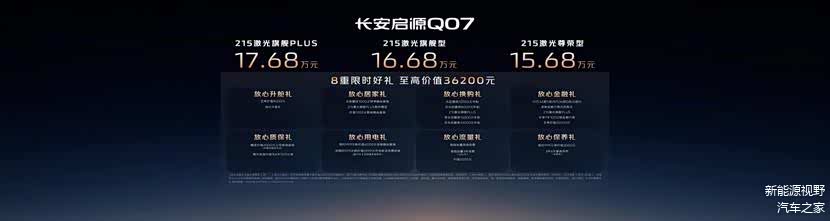 2025年10月10日长安启源 Q07激光雷达版正式上市 ,新车共发布3款车型,指导售价15.68万元- 17.68万元。动力上,搭载1.5L、1.5T插电式混动系统,综合最大续航可达1400km,支持天枢智能驾驶辅助系统。