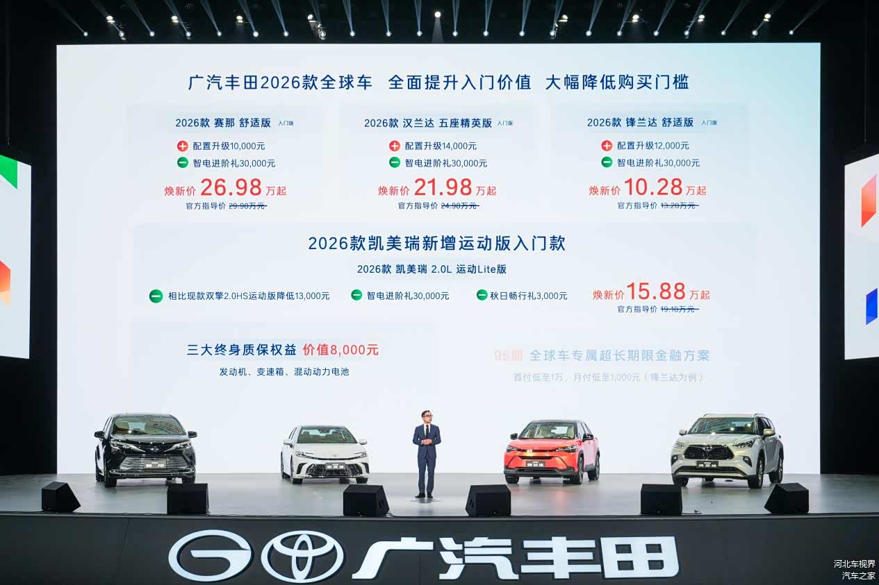 9月23日,广汽丰田在长沙举办了2026款丰田全球车发布会,没有枯燥的技术术语,没有单向输出的产品宣讲,而是用一场轻松甚至略带“自嘲”的发布会,完成了对赛那、 汉兰达(图片 | 参数 | 询价)、凯美瑞、锋兰达四款全球车的集中焕新。