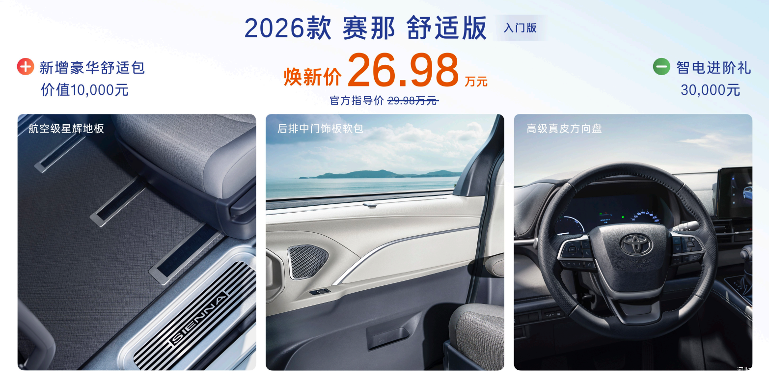 赛那主打“豪华不分级别”。入门焕新价26.98万元起。并新增“四驱臻享版”,将雷克萨斯LM同款头等舱座椅与E-FOUR电子四驱合并推出;头等舱座椅融合16点气动按摩、三档通风加热,采用半苯胺奢华真皮材质,上下车扶手升级打孔皮革包覆及镀铬装饰。新增赛铂金外观、醇厚棕内饰、“羽翼”迎宾灯、PVM全景监控系统+透明底盘功能。静谧性更媲美顶级豪车,120km/h时速下车内噪音低至61.8分贝。2026款赛那做到了“30万级定价,百万级体验”。“四驱臻享版”最终焕新价33.98万元。