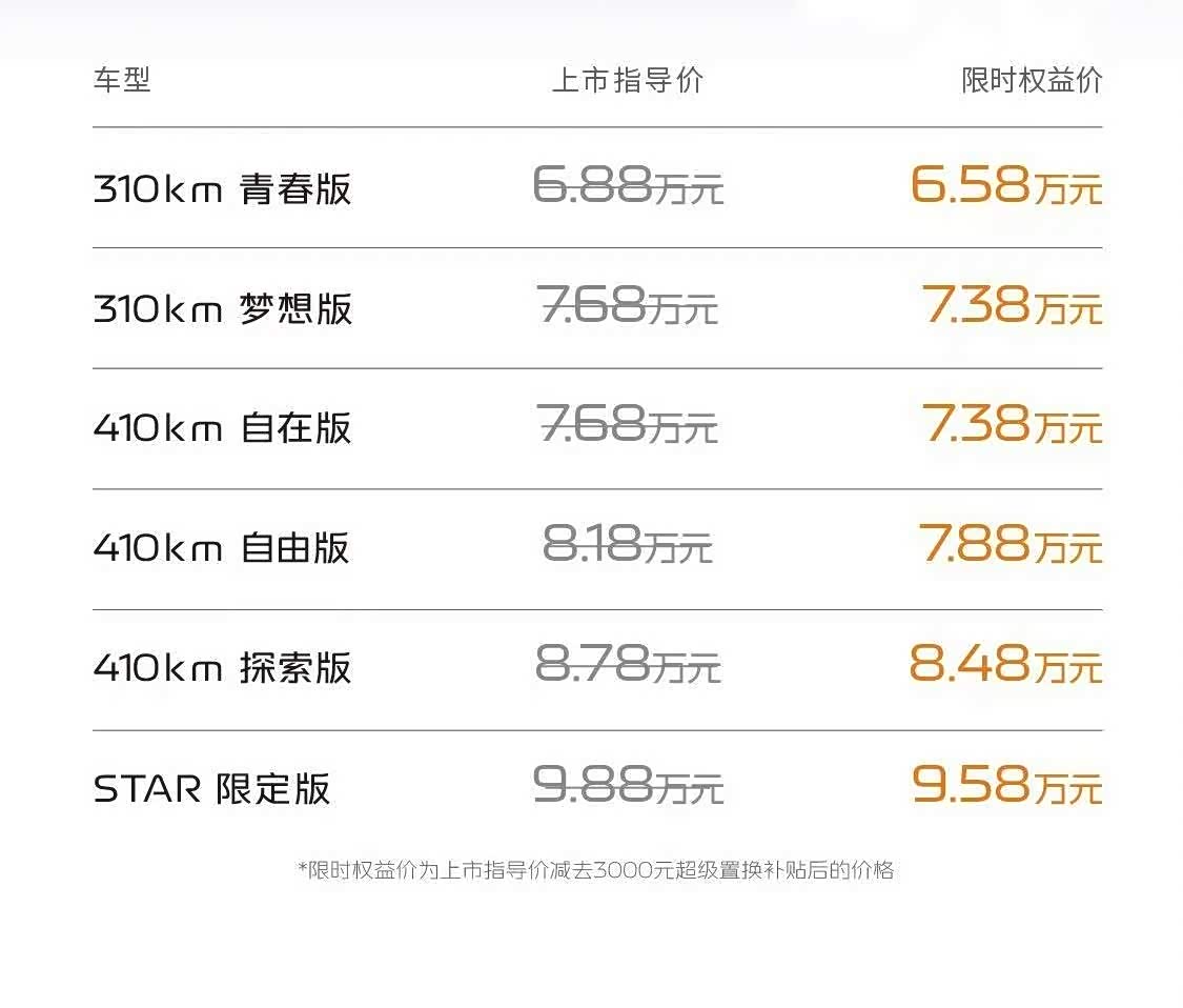 10月10号这天,笔者从吉利银河官方那儿打听到,2026款吉利 星愿(图片 | 参数 | 询价)已经正式上市啦。这次一共推出了6款车型,官方指导价最低只要6.88万元,要是享受限时权益价,那6.58万元就能拿下(这里面已经包含了3000元的无门槛置换补贴)。而且呢,还新增了410km自在版,这可是410公里纯电续航系列里的全新入门车型哦。