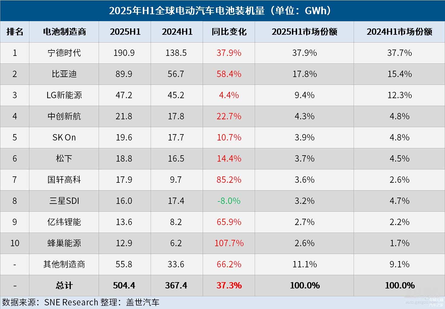 与此同时,2025年上半年数据显示,中国动力电池企业全球市场份额已突破68%,宁德时代和比亚迪两家就占据全球装车量的半壁江山。具体来看,宁德时代装车量占比高达37.9%,比亚迪占比17.8%,两者合计占据国内市场超一半的份额。而中创新航、国轩高科、亿纬锂能、蜂巢能源装车量均超10GWh,形成了坚实的第二梯队。
