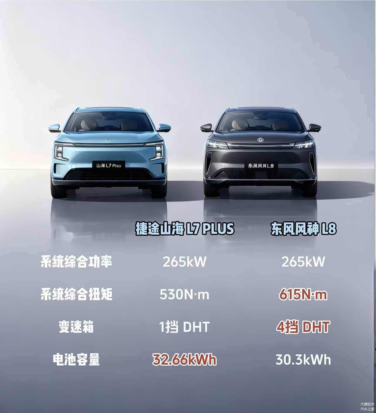 在当前国内汽车市场,10-15万元区间的插混SUV赛道已然进入白热化阶段。对于家庭用户而言,这一级别车型不仅需兼顾空间实用性与乘坐舒适性,更要在续航能力、能耗表现上达到平衡,堪称对产品综合实力的“全能型”考验。近期,捷途山海L7PLUS与 东风风神L8(图片 | 参数 | 询价)两款新车的上市引发不少消费者关注,本文将从家庭用户核心关切的维度,对两款车型进行专业对比分析,为购车决策提供参考。