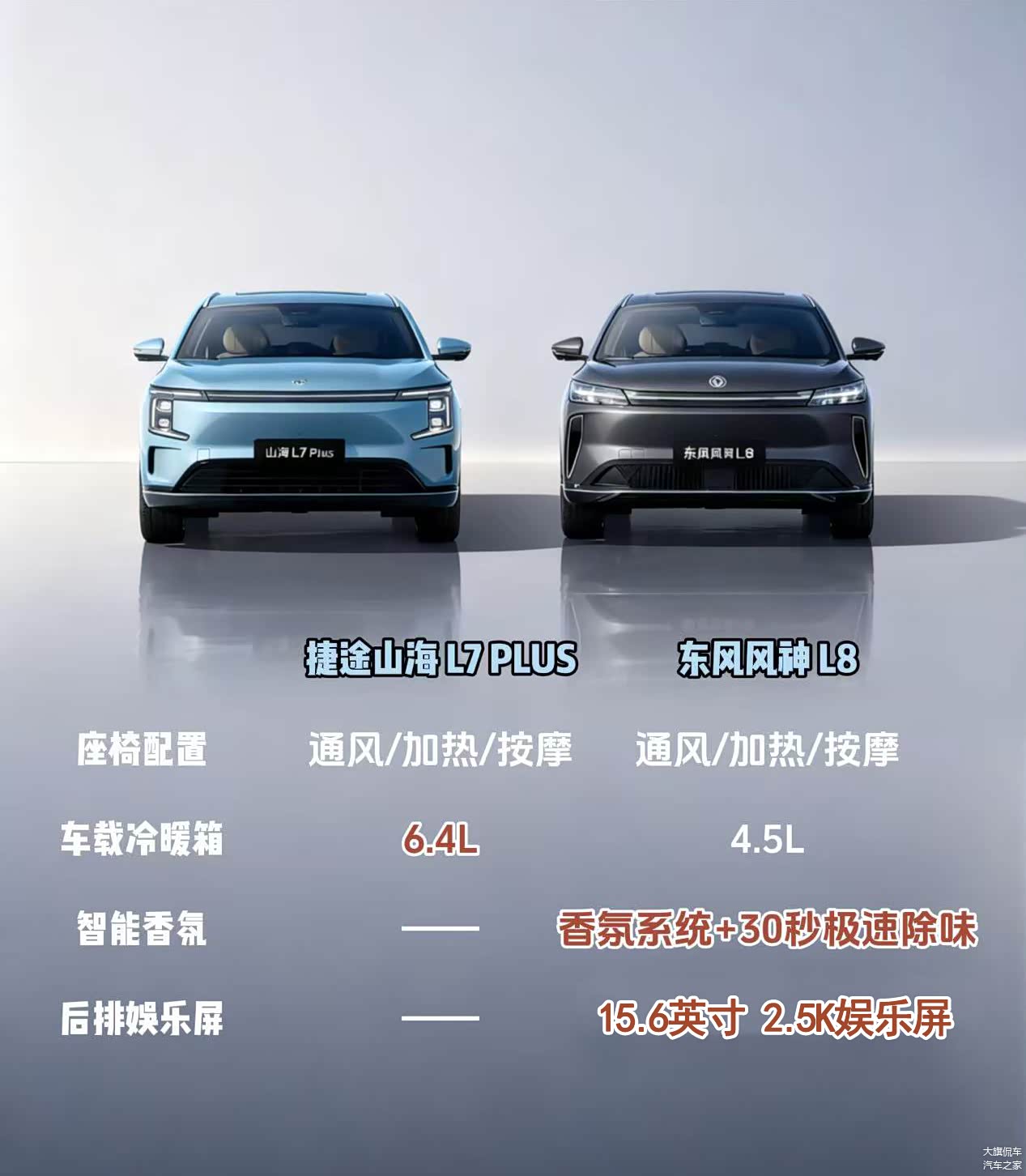 从家庭用户的“全员体验”来看,东风风神L8的配置更贴合“长途出行场景”,兼顾舒适性与娱乐性,而捷途山海L7PLUS的冷暖箱容积更大,在“露营方面”上有一定优势。
