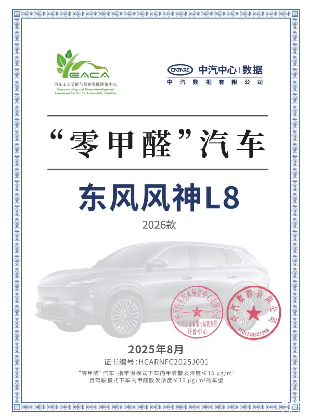 •东风风神L8:主打“零甲醛汽车”认证。座椅和内饰板使用婴儿级亲肤材质,座椅填充物用净味舒适海绵,并搭配环保水性胶,减少看不见的有害物。它还配备30秒极速除味功能,像带孩子去吃火锅、或者放过外卖后,残留的味道能更快散去。