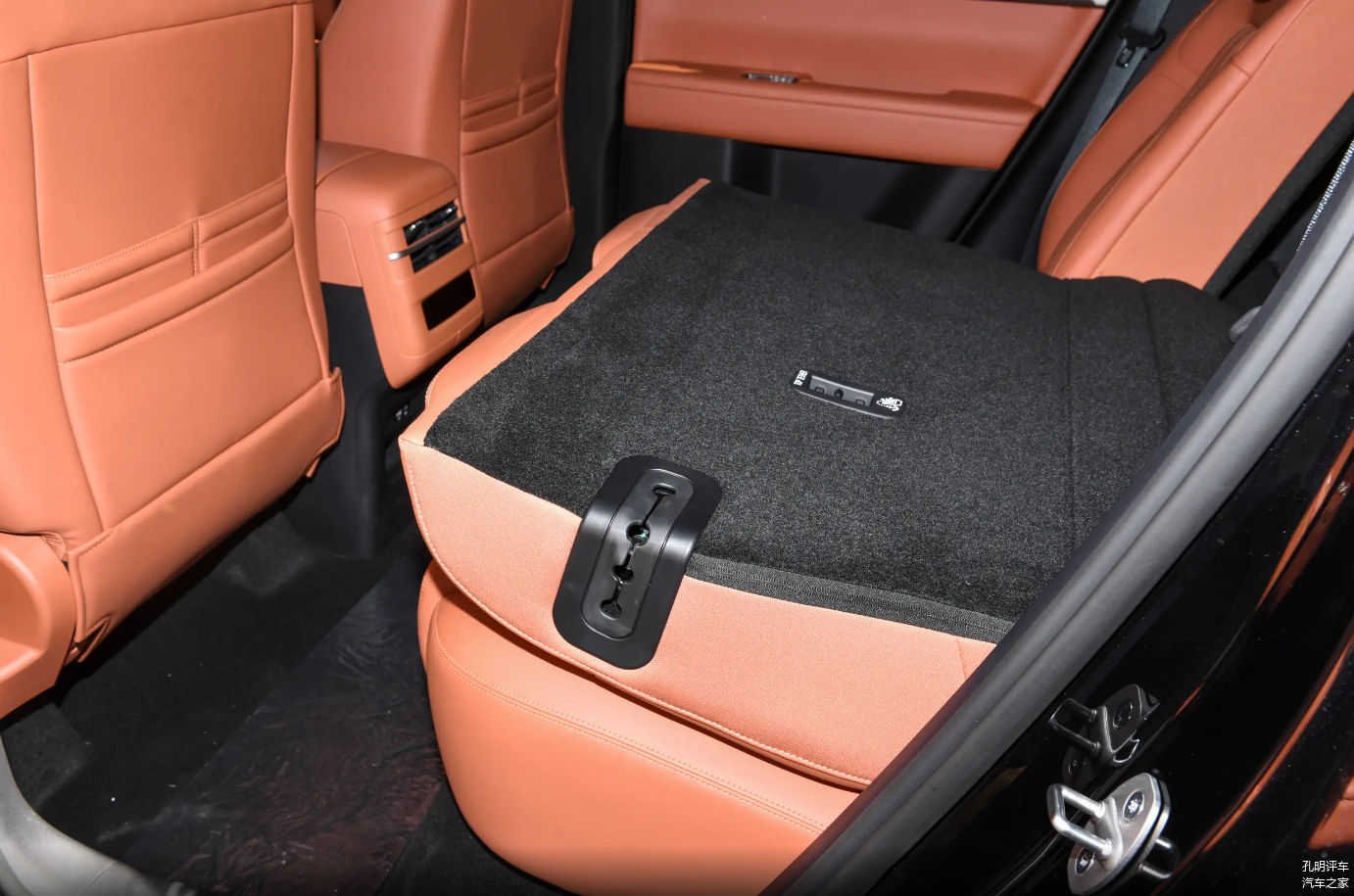 那采用5座设计的情况下,这款方程豹钛7整个后排确实就非常宽敞了,尤其第2排的两侧位置座椅坐垫明显加长,1.8米身高的成年人在后排两侧位置翘起二郎腿没什么问题。整个后排地板处理也相当规整,虽然中间座位腿部会受到一些扶手箱的影响,但脚下并没有任何隆起。