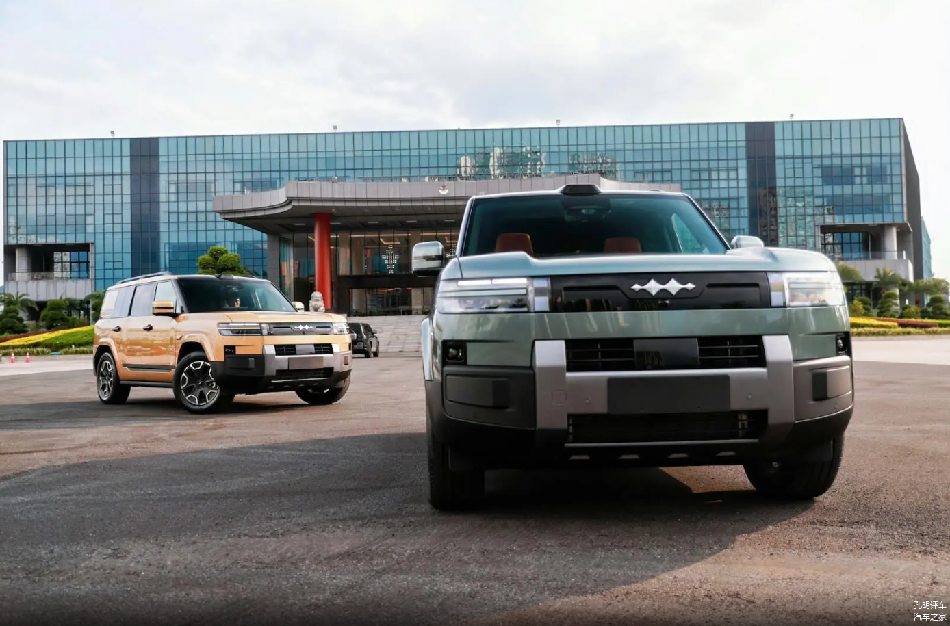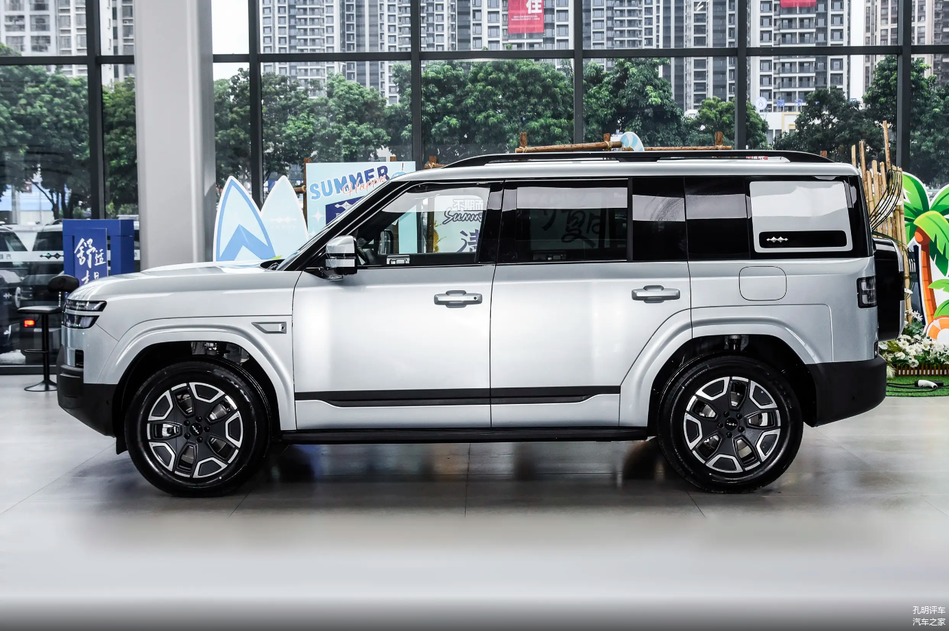 方程豹品牌的外观造型设计也逐渐找到了一种自己独特的风格,这款车同样是流行的方盒子设计元素,车头前脸灯光比较狭长,侧面看有点类似路虎卫士那种悬浮车顶的效果,不过边角的细节处理还是比较圆润一点,并不是像之前的硬派越野产品那么生硬了。