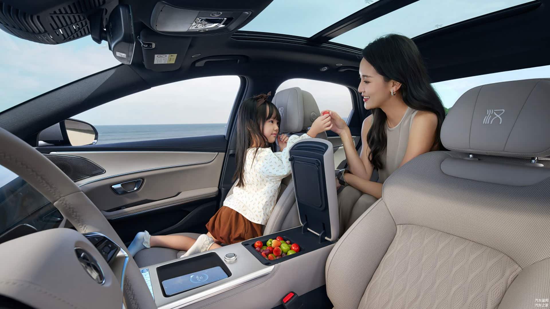 还有舒适便利配置,4.5L的智能冷暖箱,-6°C-50°C的宽温域调节,或者是炎热的夏季提供冷饮,或者是为婴幼儿提供适宜温度的温奶,汉长续航版都能做到。