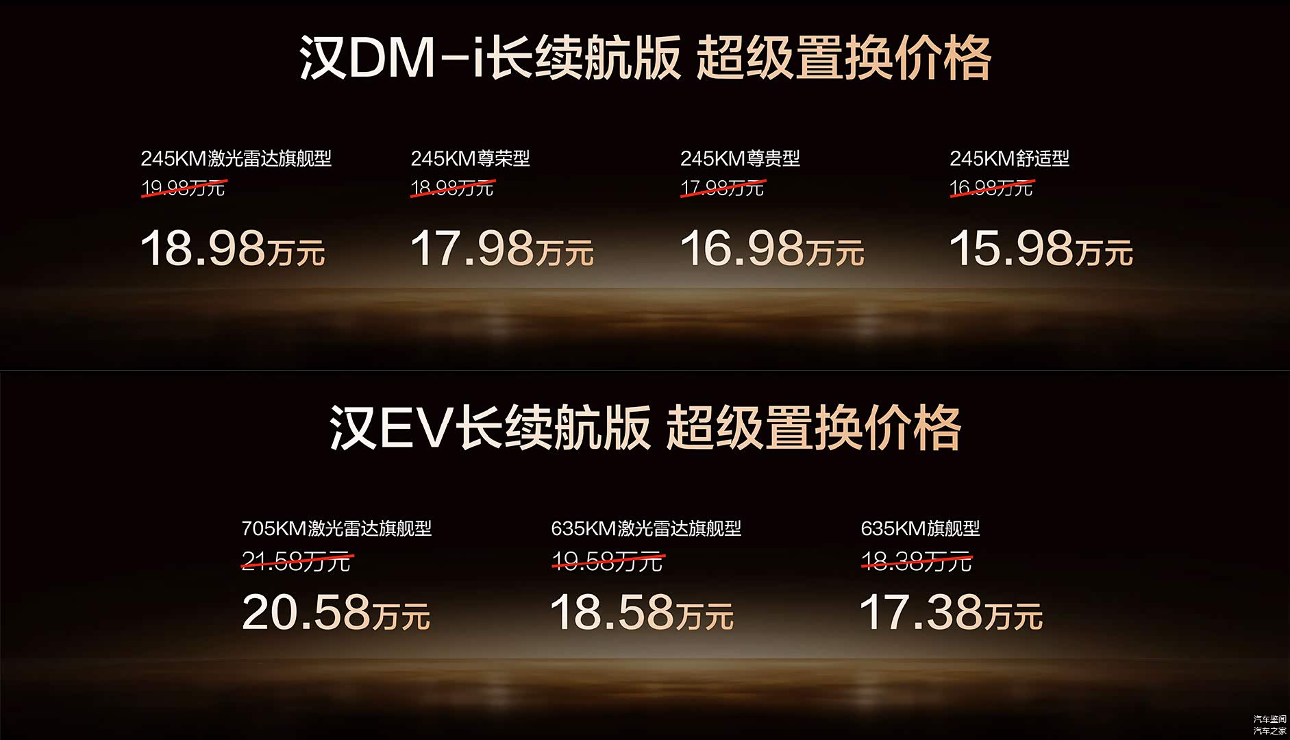 长续航版汉家族定价也很有诚意,10月底前买定离手还能享受1万超级置换补贴,因此汉DM-i的超级置换补贴售价区间就成了15.98-18.98万元,而汉EV的超级置换补贴价格区间就成了17.38-20.58万元,如果您还能拿到“报废焕新国补”呢!您说说是不是想想都觉得很高兴、很超值?