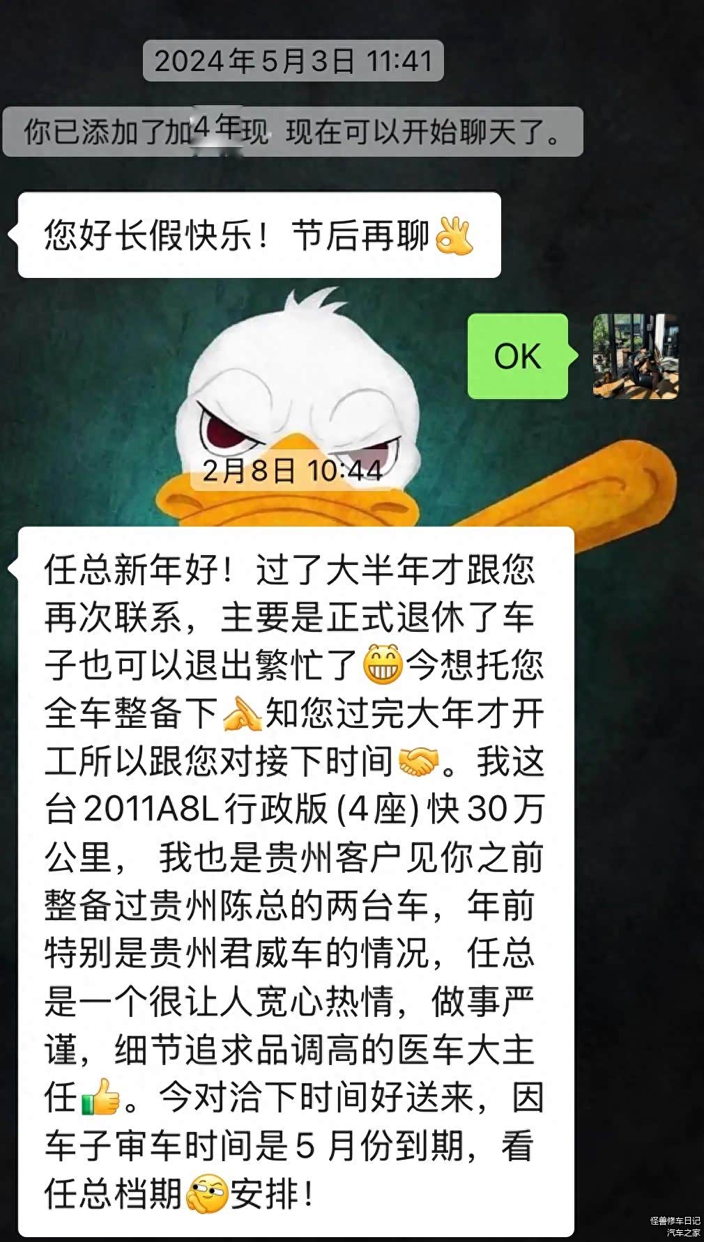 车主2024年加的我好友,中间咱们也没聊天,然后2025年春节后,直接联系我说想整备一辆A8,车主还是一位退休的大叔。