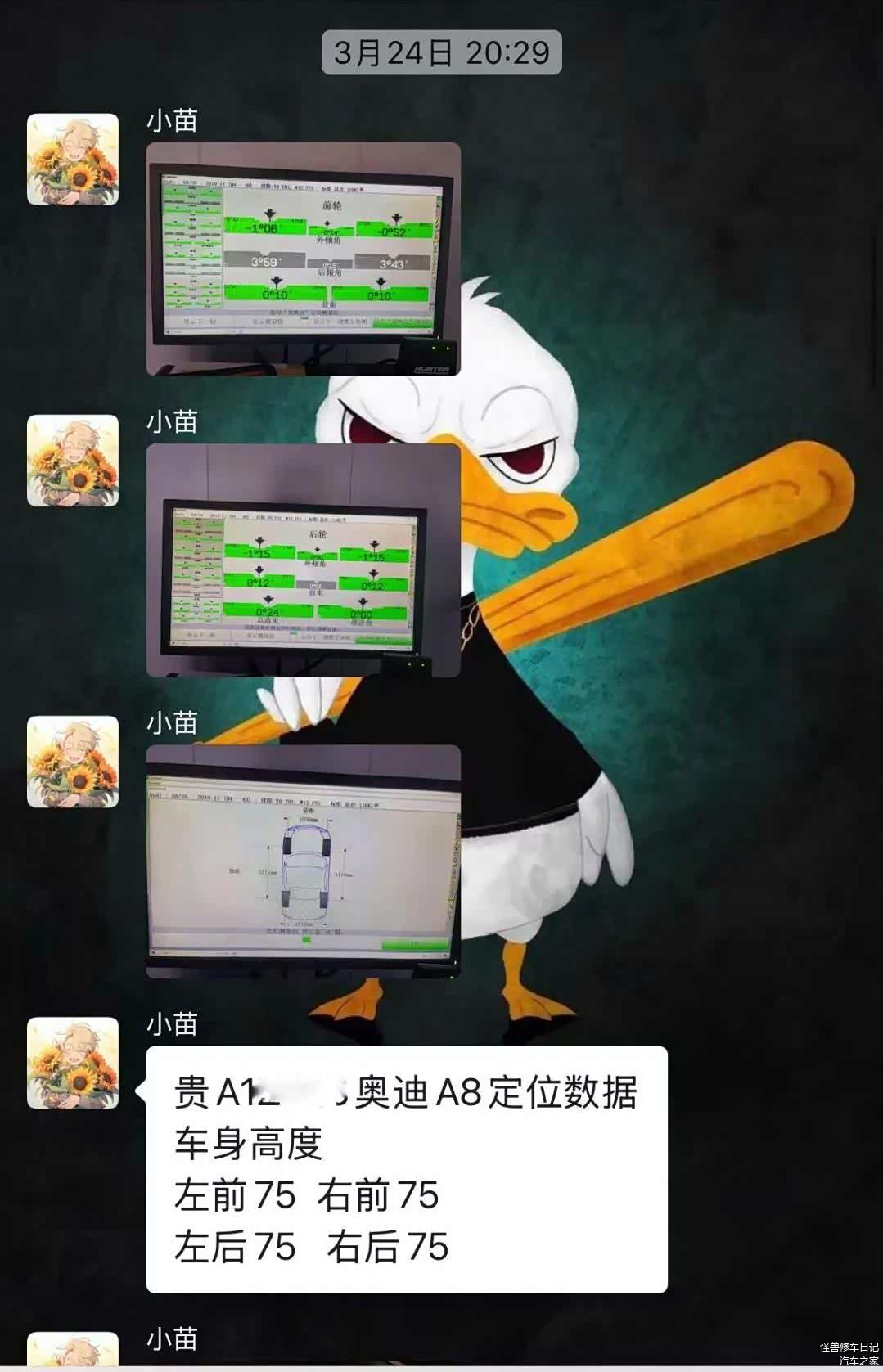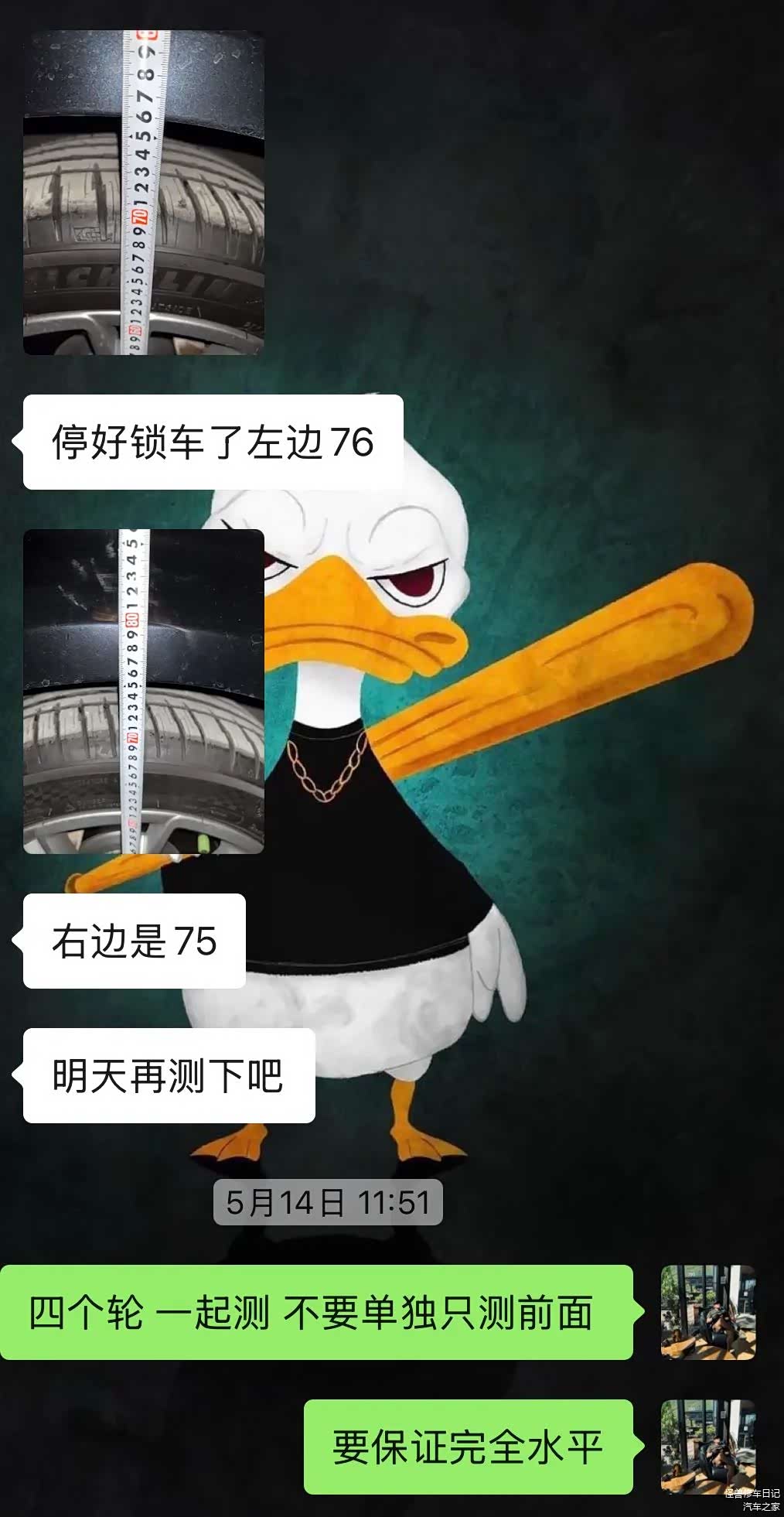过了一段时间我又问车主了,他还是测量出来个76,因为我们反反复复测量都是75,我们是在四轮定位设备上面测量的,那是绝对水平的。所以我建议车主还是去店里设备上标定一下再测吧。