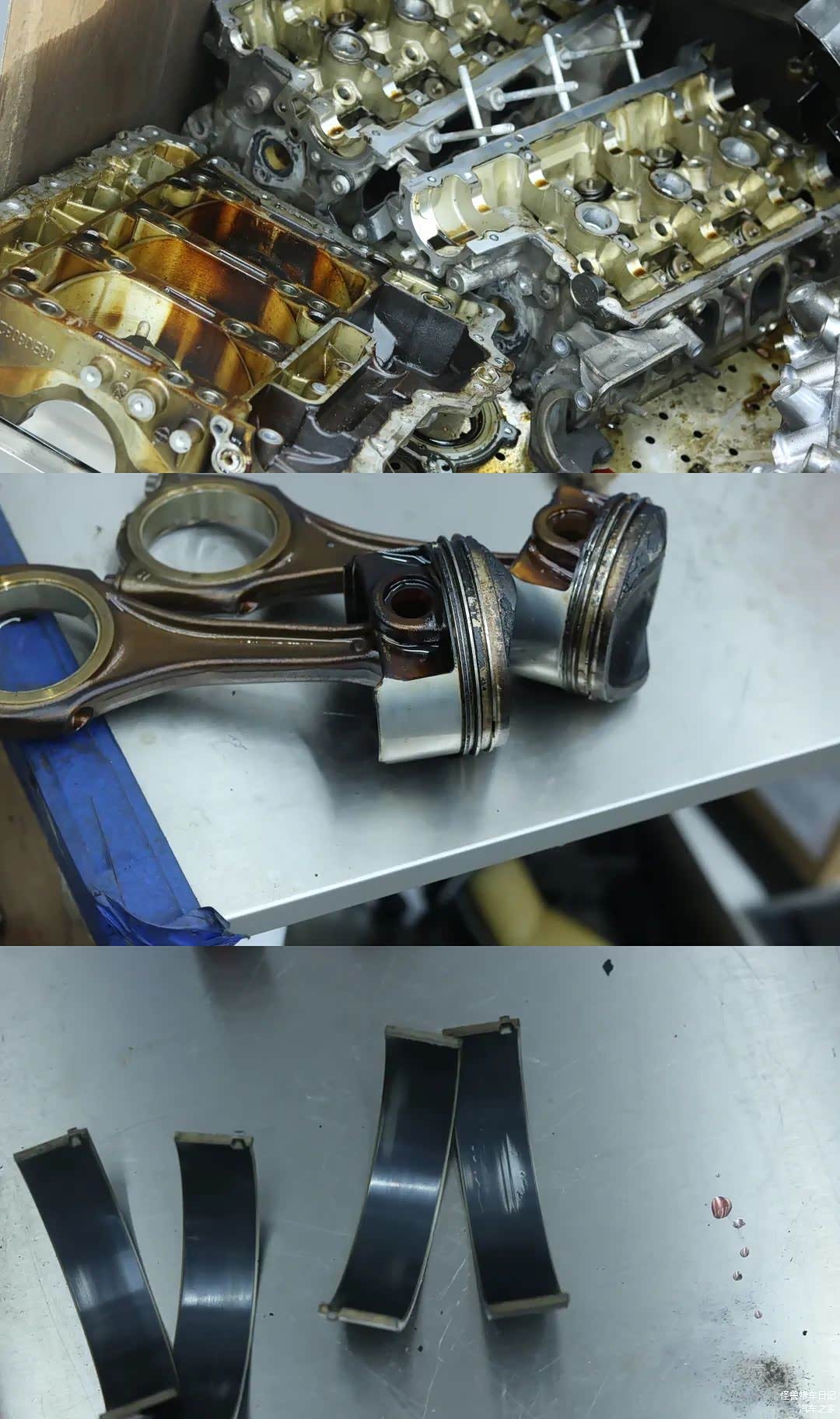 分解后,烧机油问题全部暴露了,缸体内部有窜烧迹象,活塞环卡死,瓦片磨损等等。