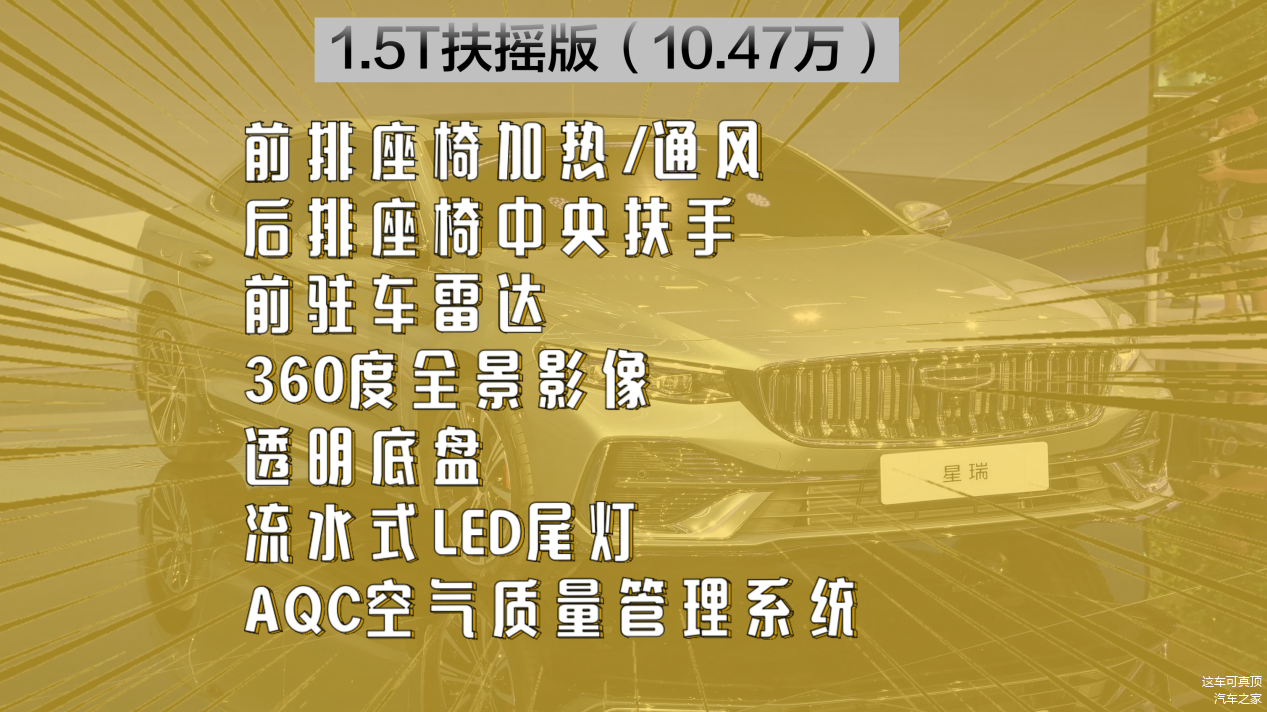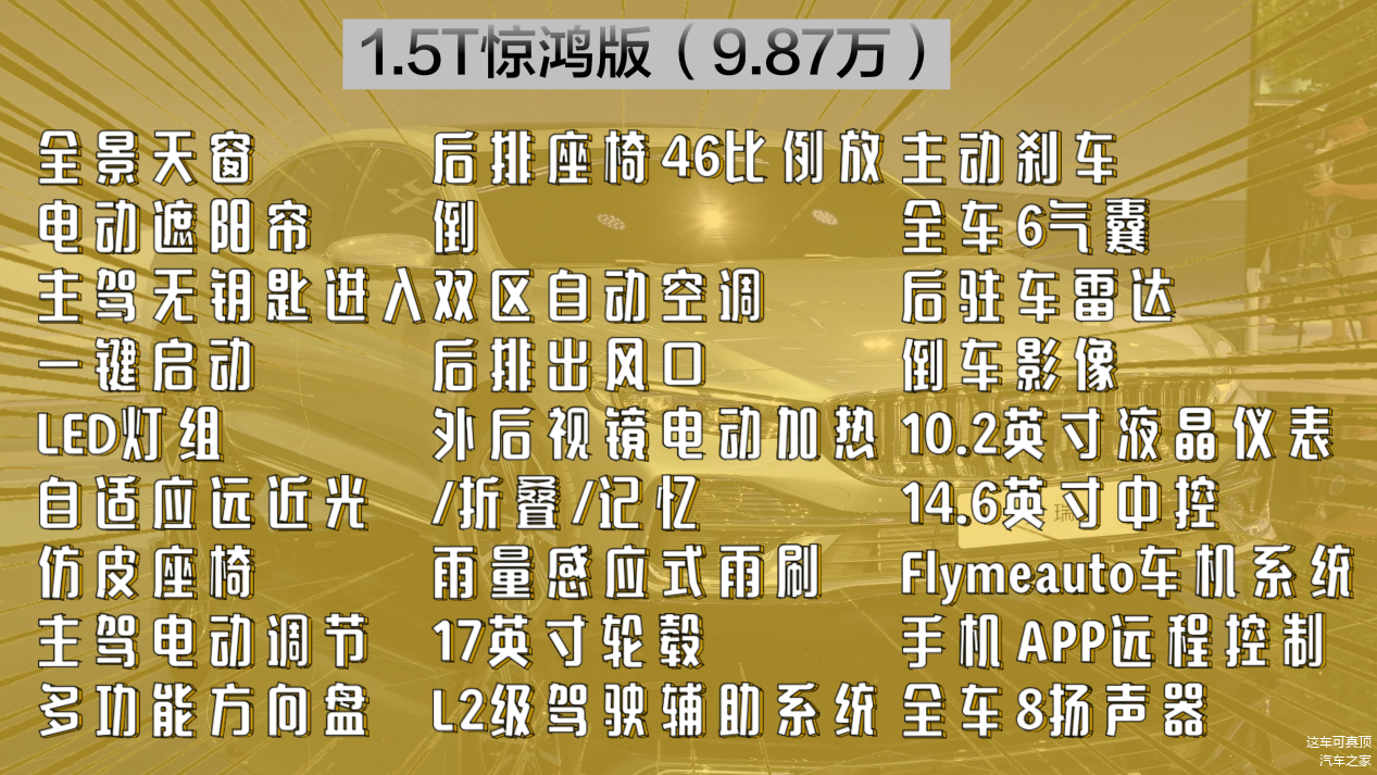 好了,下面我们具体配置,具体分析。先看一下9.87万的入门款,1.5T东方曜·惊鸿版。配置如图所示,没有什么特别亮眼的东西,整体配置水平,和一个中配的大众速腾差不多。 像是全景天窗,主驾座椅电动调节,倒车雷达影像,基础的L2,全车六气囊,都是标配,两块屏幕的尺寸也都没有缩水。但是买星瑞,而不选速腾的用户,普遍对配置的要求会更高一点,够用,肯定不是他们的核心诉求。
