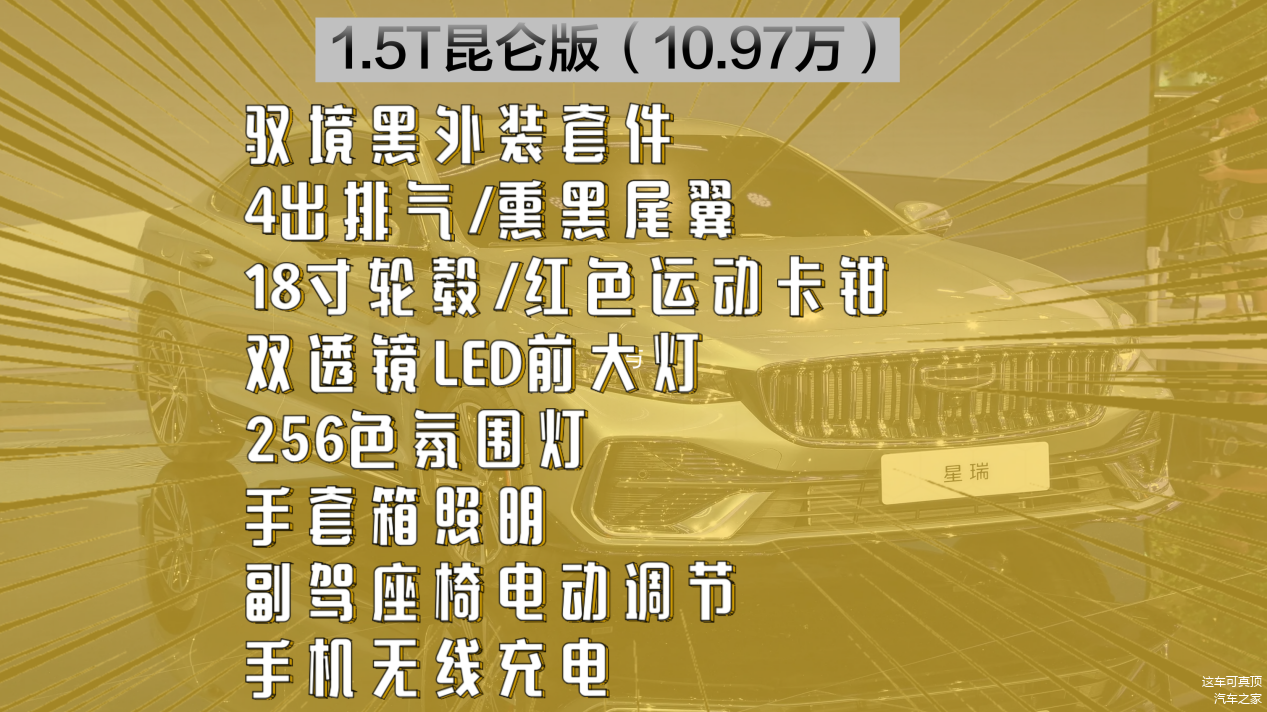 好了,总结一下。不管你要不要高阶驾驶辅助系统,1.5T东方曜·昆仑版,都推荐你优先考虑。买其他版本,或多或少的都会有一些遗憾。真追求极致的动力,2.0T东方曜·霄汉版+选装包,它就是一个不错的“小钢炮”,高配的性价比反而不高,同价位B级车,会更值得选择。